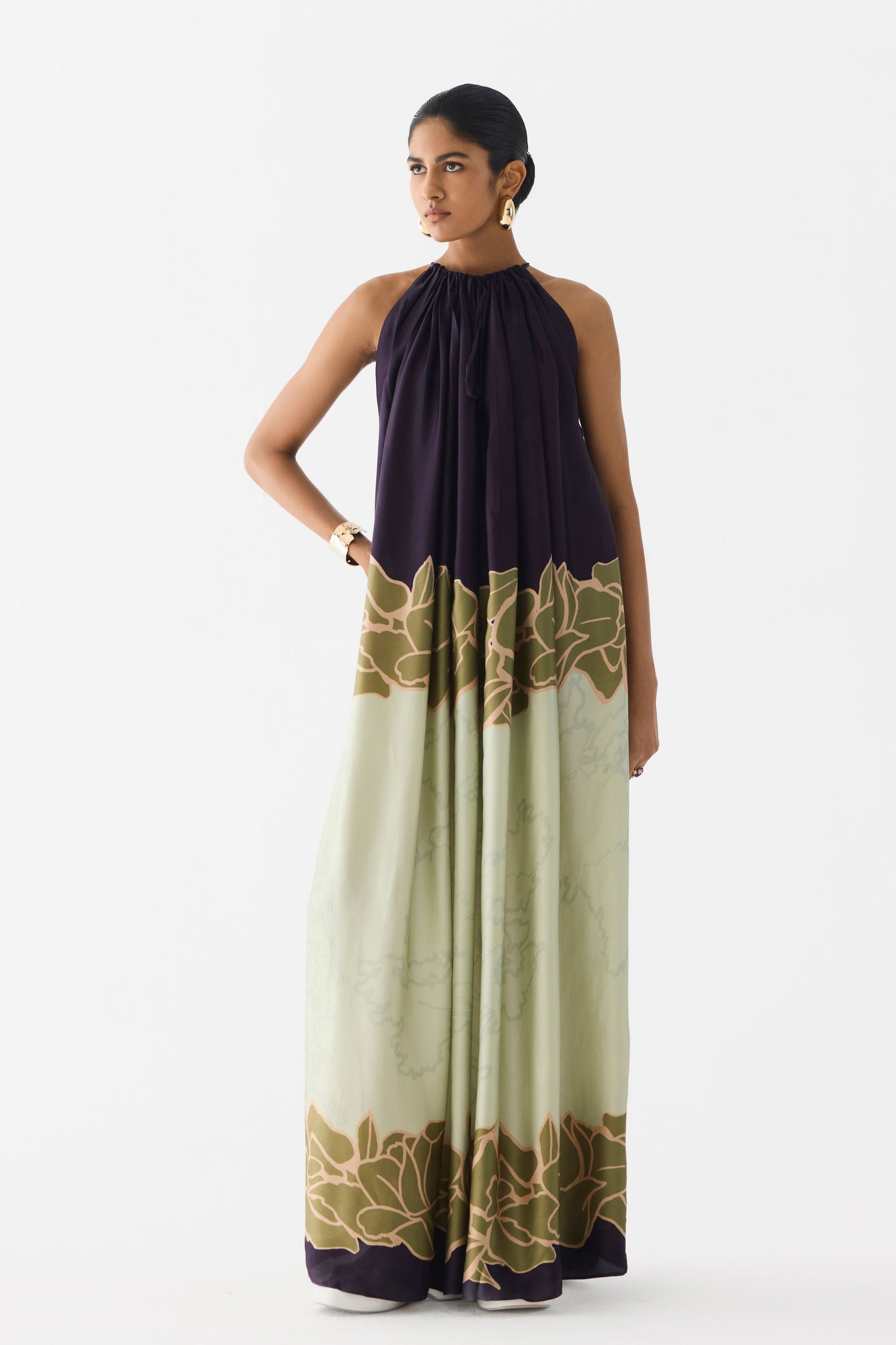 • The Green Alba Halter Dress crafted from our stunning vegan silk fabrication, trans-seasonal, is a statement piece. This dress, printed in our Green alba placement flower print, has a front knot opening. With halter sleeves, the neckline has a drawstring and is adjustable. The fall of the dress is flowy and it is full length till the floor. Wear it with heels for an elegant look. The model is wearing a Size S.