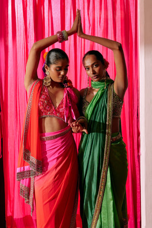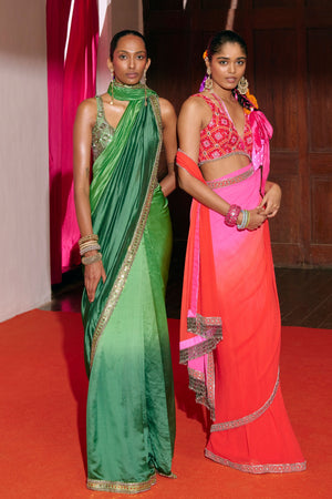 • This look includes a green dip-dye sari with an embellished blouse.