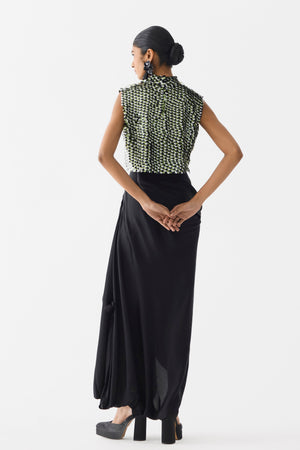 • The Green Paradise Sequin Top with Knot Skirt crafted from our stunning organza fabrication, trans-seasonal, is a statement piece. This blouse, is hand embroidered with tricolour sequin all over resembling the birds of paradise flower. Sleeveless with side zippers, this blouse has a high neck collar with back hooks. It is paired with our contrast knot skirt in vegan silk in black colour. Wear it with heels for an elegant look. The model is wearing a Size S and is 5'10.