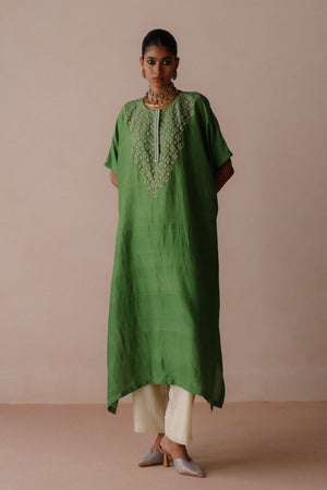 • This Silk Kaftan showcases a hand embriodered yoke detailed with dori work and delicate pearls, paired with lightweight chanderi Pants for a refined, effortless look.