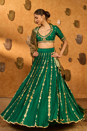 • This green crushed lehenga comes with an attached cancan for a graceful flare, featuring totem line foil prints repeated horizontally across the skirt and finished with a delicate gota detail at the hem. It has a side zip closure for ease and comfort. The hand-embroidered blouse is playfully accented with little pot foil print, adding charm to the look. Completing the set is a crushed banarasi tissue dupatta, edged with a shimmer fish-print border and gota detailing, catching the light beautifully with every movement.