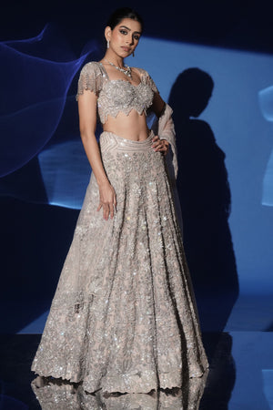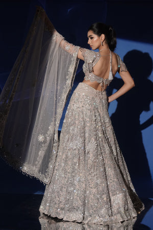• Enveloped in the luminous charm of soft grey, this lehenga set exudes modern elegance with a hint of ethereal glamour. The net lehenga glistens with all over sequin, bead, and cutdana hand embroidery, creating a dazzling play of light with every movement. Its flowing silhouette is perfectly complemented by the statement blouse, hand embroidered with sequins and finished with delicate fringe sleeves, adding a touch of contemporary sophistication. A sheer net dupatta in soft grey, embellished to maintain its airy elegance