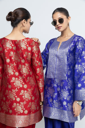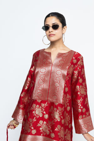 • Red brocade floral jaal silk kurta with woven benerasi details paired with a matching dhoti