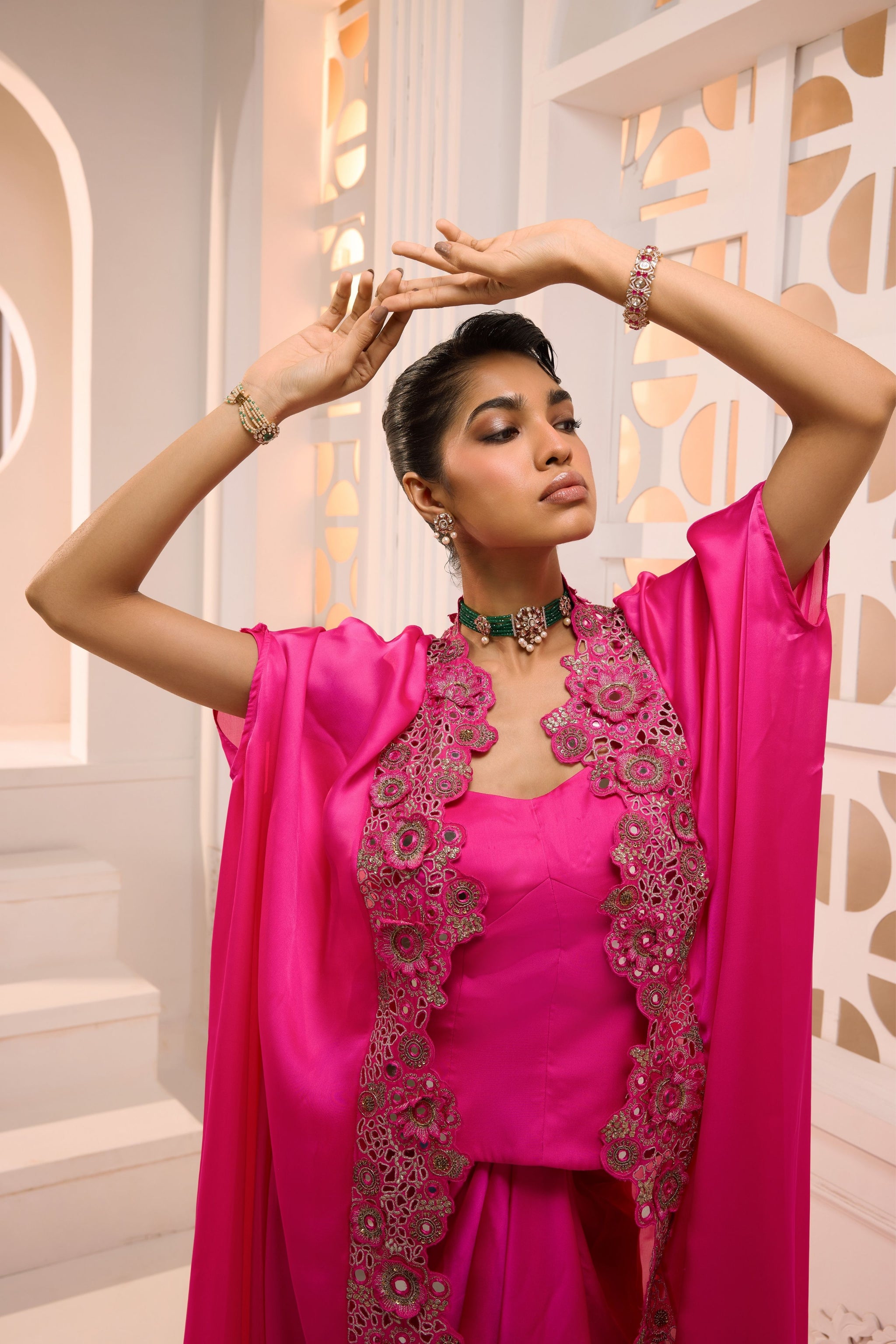 • This striking fuchsia ensemble features a draped dhoti-style skirt and matching corset style top, layered under a sweeping floor-length cape with ornate hand embroidered 3d flowers, bead & cutout mirror-work border. It is a bold celebration of color and texture, designed for the woman who seeks to merge traditional silhouettes with a high-impact, editorial flair.