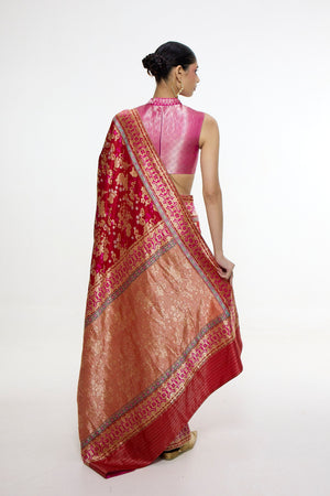 • Introducing silk dialogue, a collection that celebrates the playful dance between oriental culture and banarasi heritage–where motifs, ideas, and techniques come together through a craft-centric lens. Handwoven in the kadhwa banarasi technique and crafted from the softest, most fluid satin silk, this ruby red masterpiece features intricate motifs inspired by oriental culture, allowing for endless styling possibilities. We recommend cinching your saree at the waist with a handwoven banarasi belt to create a structured look. This one's perfect for festive celebrations and wedding occasions, it’s the saree that ensures all eyes are on you.