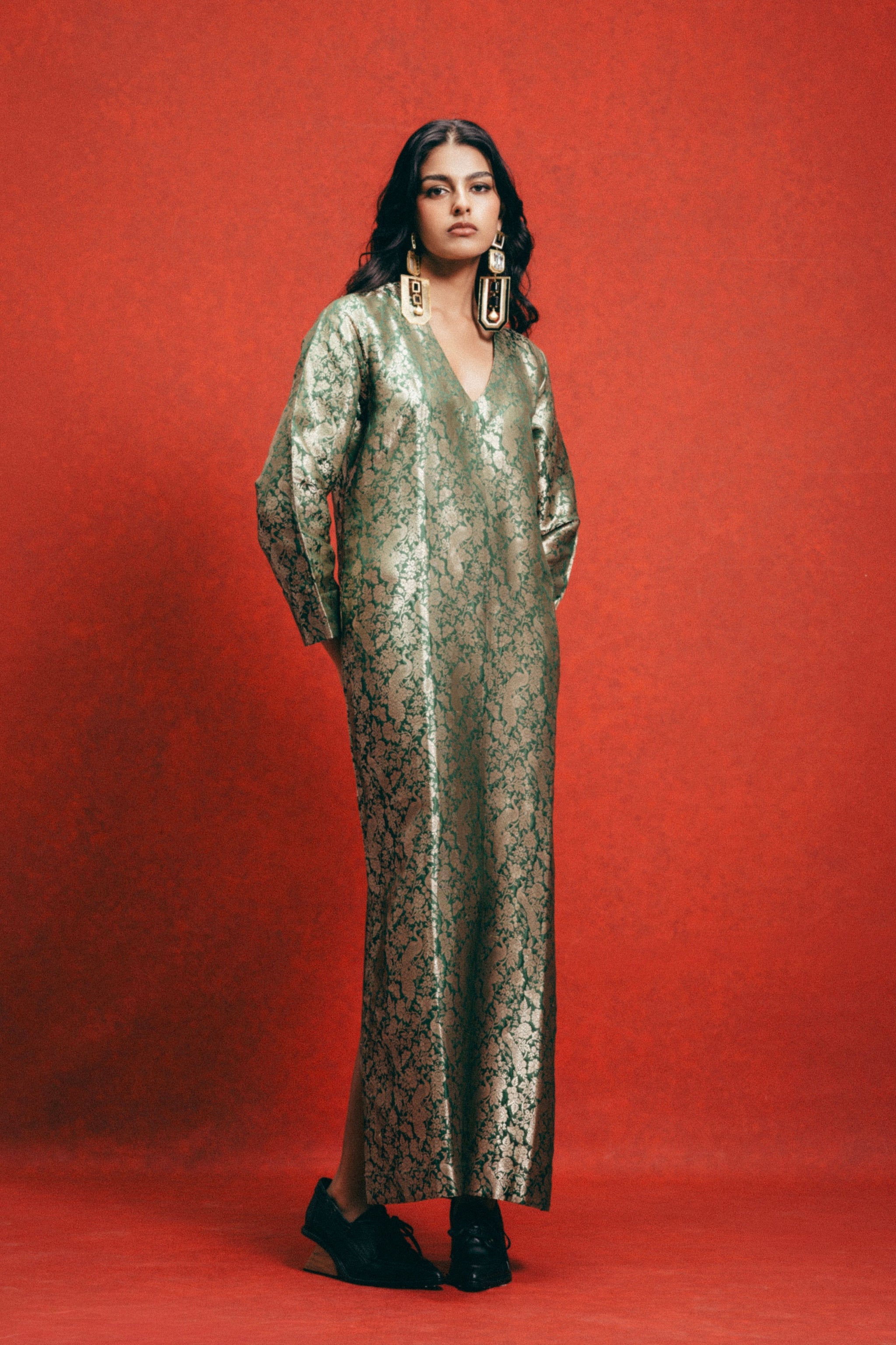 • Crafted using the finest silks, Ekaya introduces one of its boldest new expressions yet, the Banarasi kaftan. This sage green kaftan is handwoven in the Banarasi Emboss technique and crafted in pure silk. Cut in a fluid global silhouette, it features a V-neckline and side slits that feels elevated. Designed for styling, this kaftan adapts to how you wear it, from day to evening, across settings and moods. It's made for the global woman with an Indian soul. Please note: The kaftan lengths cannot be customised longer than 56 inches.