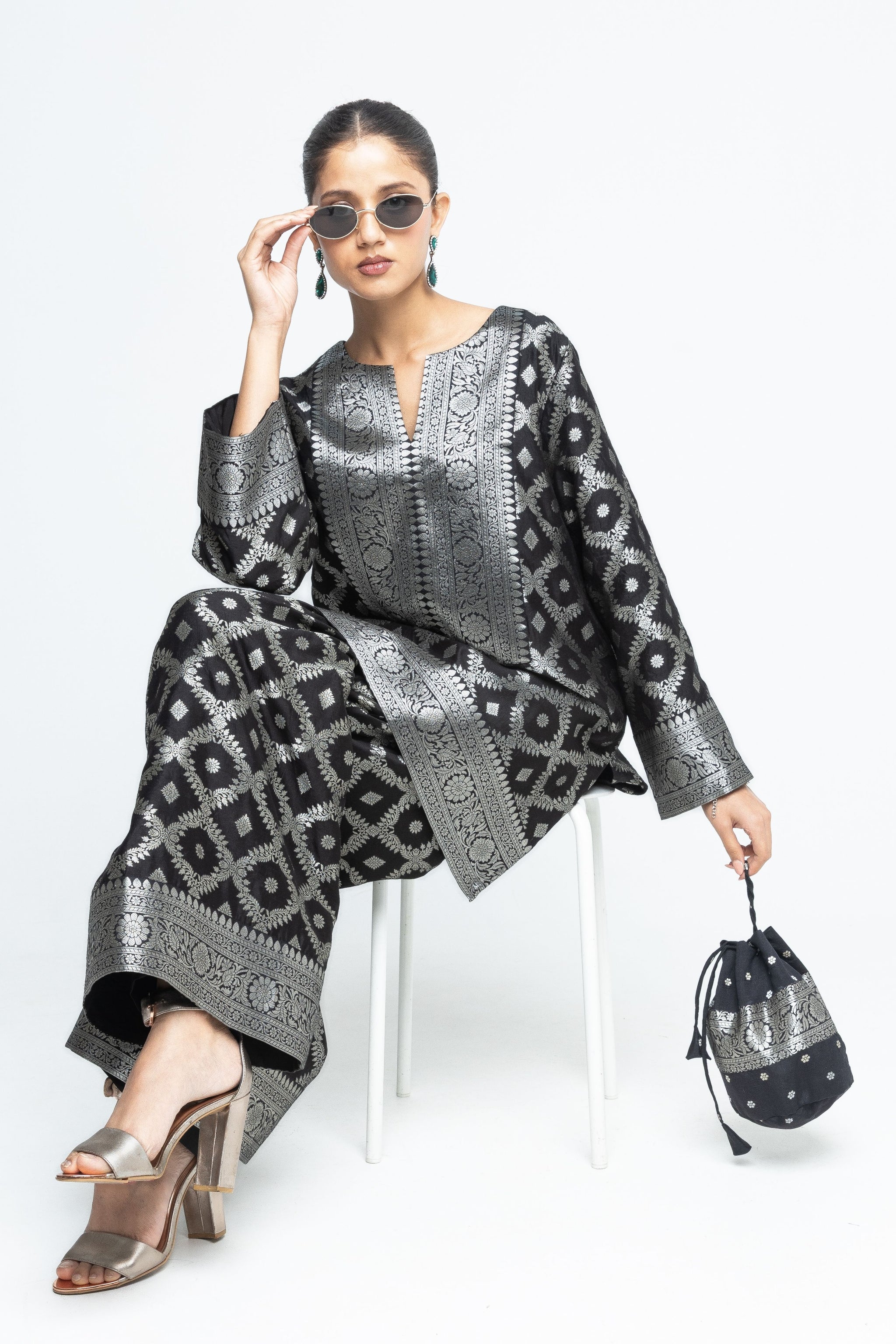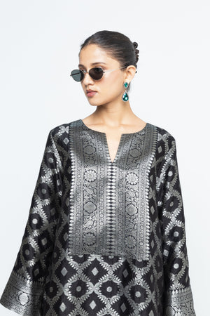 • Black jaal silk kurta with woven brocade details on neck sleeves and bottom paired with matching pants