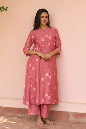 • The hibiscus embroidered kurta set features delicate floral embroidery scattered across the front and sleeves, adding a soft festive charm to the silhouette. The coordinating pants are detailed with subtle embroidered accents, bringing the look together as a relaxed yet polished ensemble. Ideal for effortless festive dressing and elevated everyday wear.