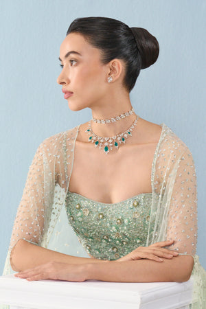 • Sea green georgette high waist sharara with a strappy blouse and tulle cape. This set has sequin, cutdana, resham, pearls and sequin flower applique