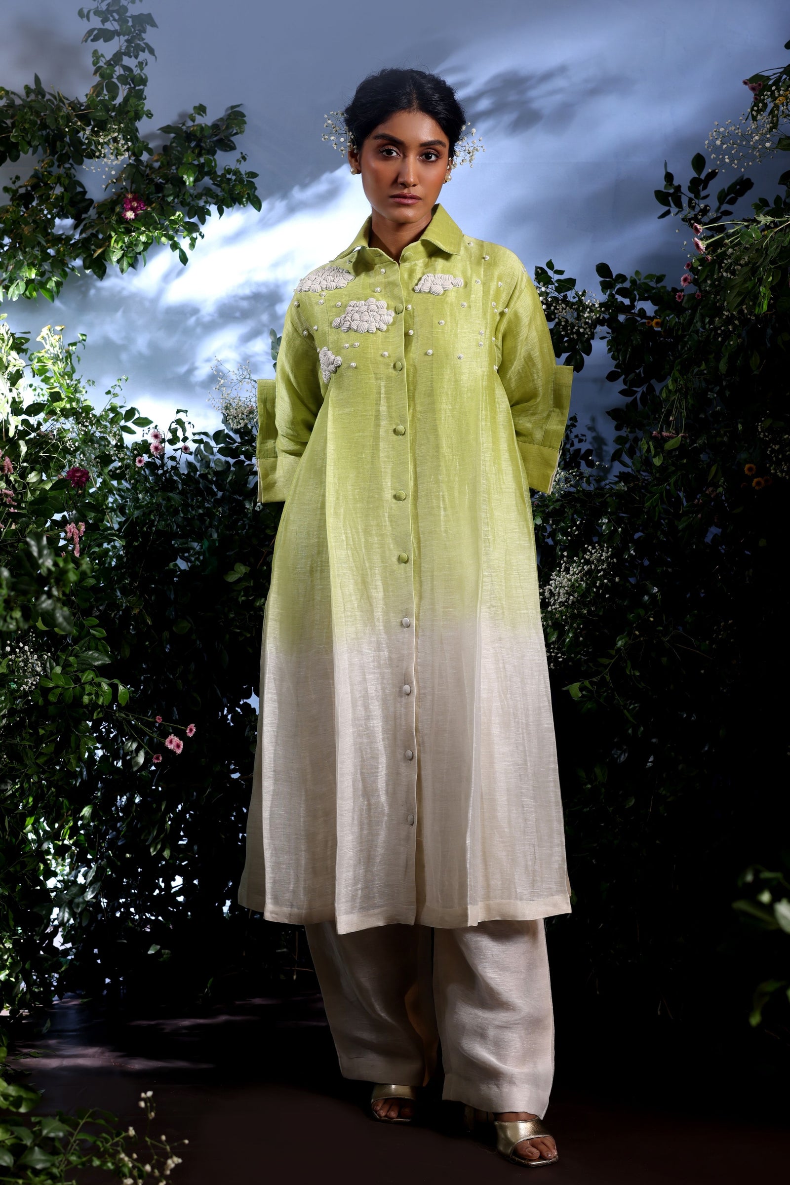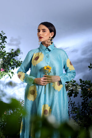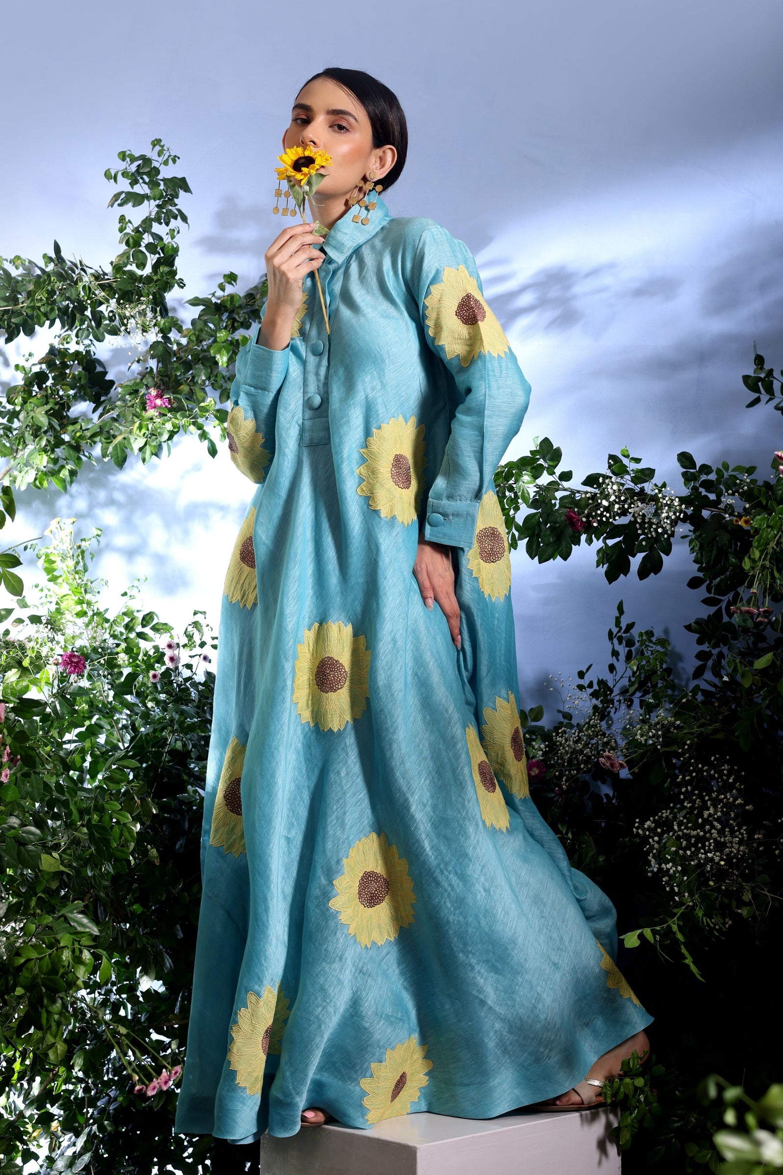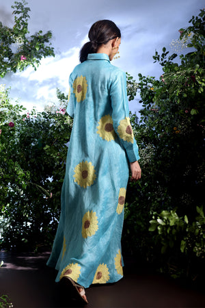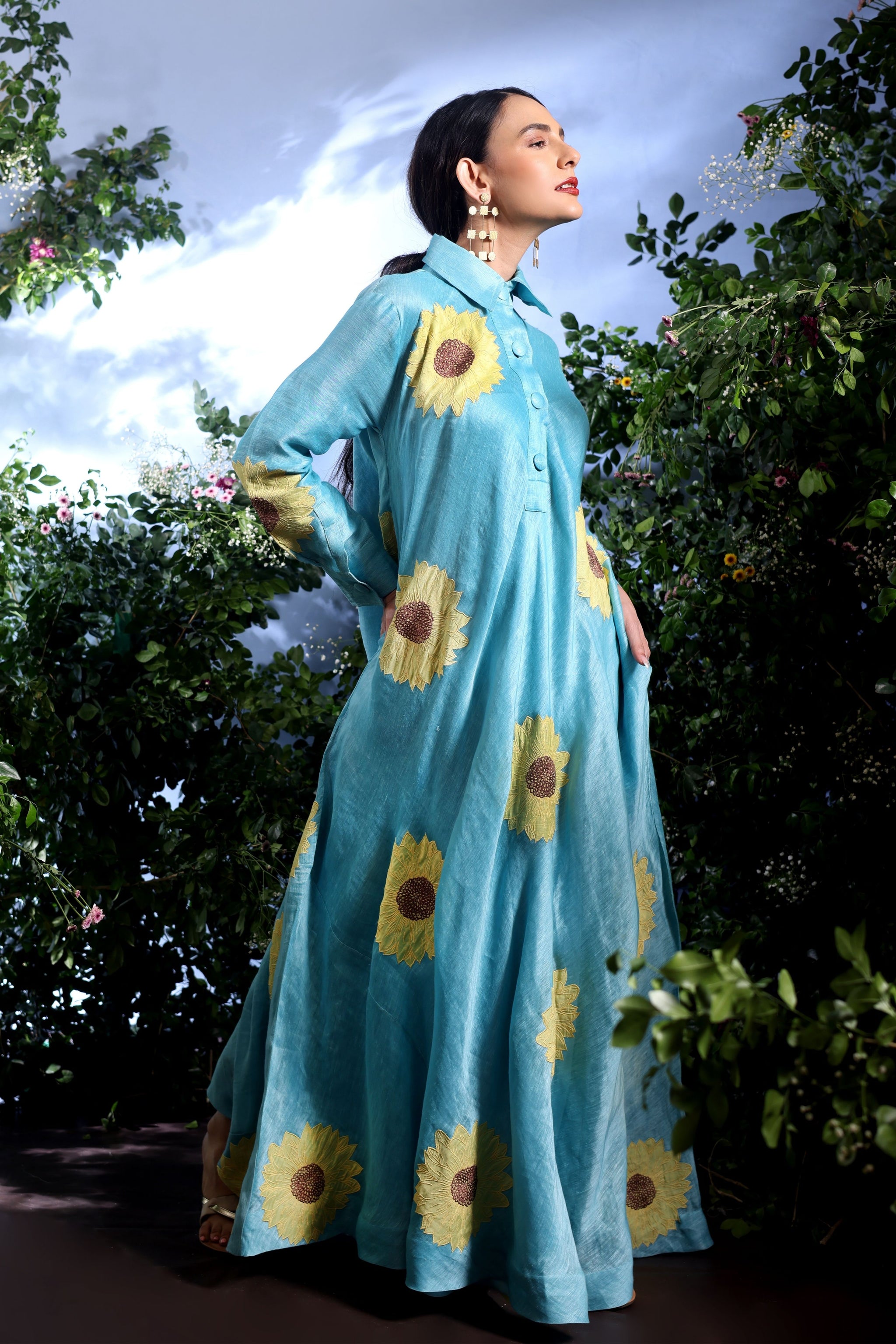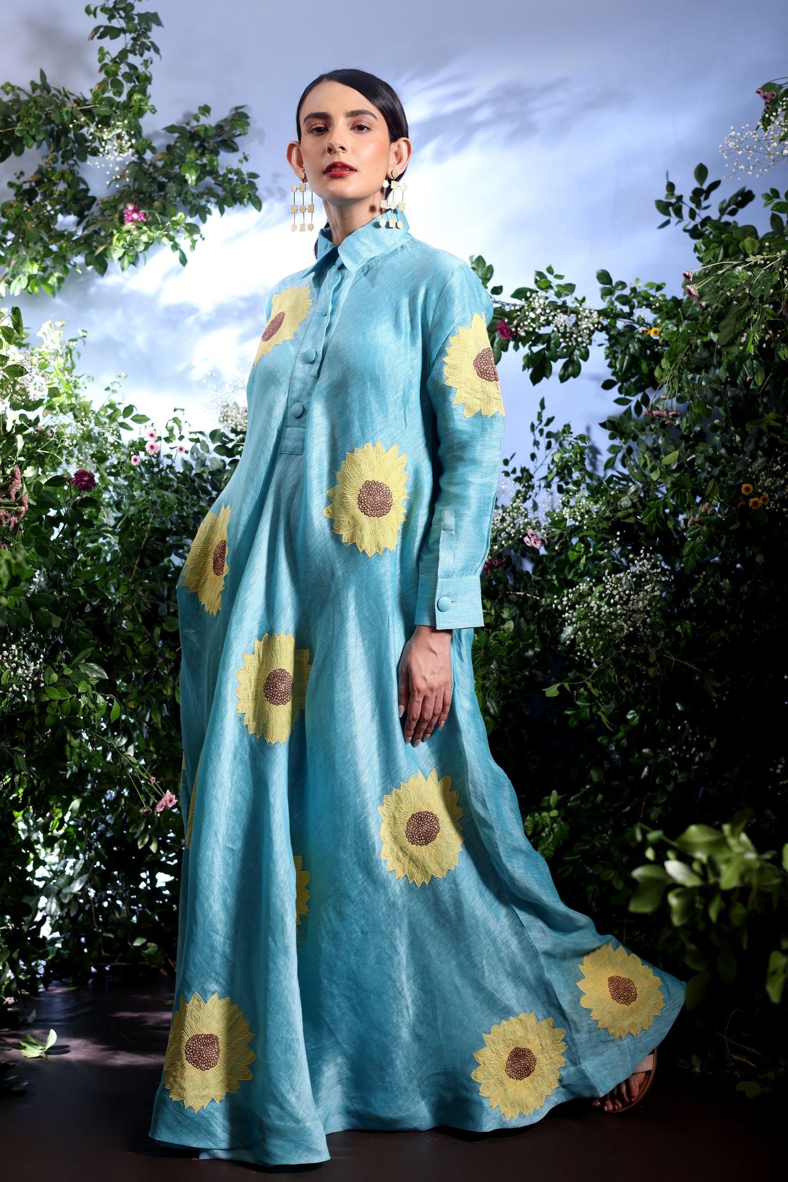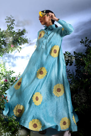 • Pure linen buttoned long shirt dress featuring hand-appliqued large sunflower motifs scattered all over for a bold, statement look. Finished with hand-detailed cuff buttons, it’s breezy, flowy, and perfect for spring-summer blooms.
