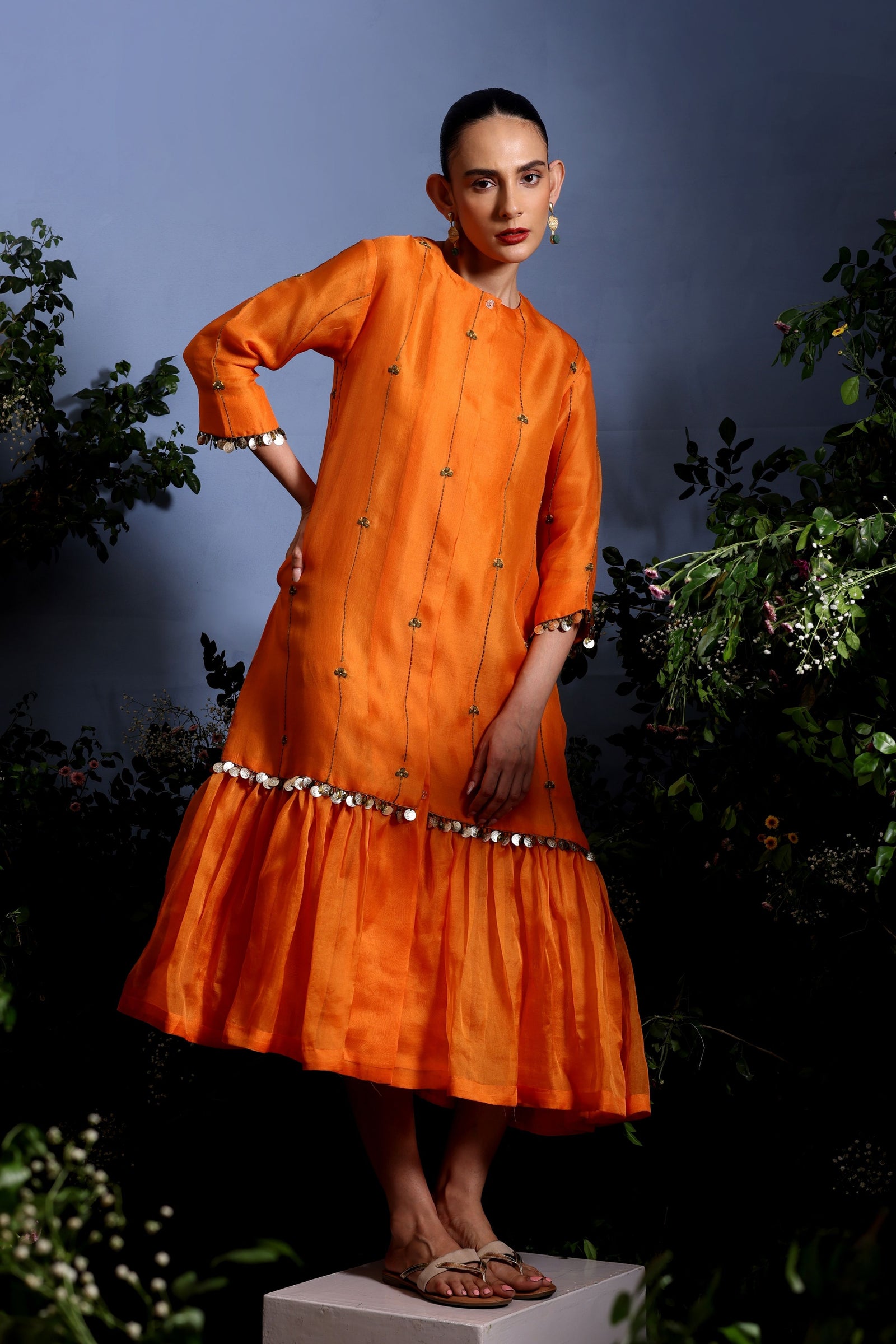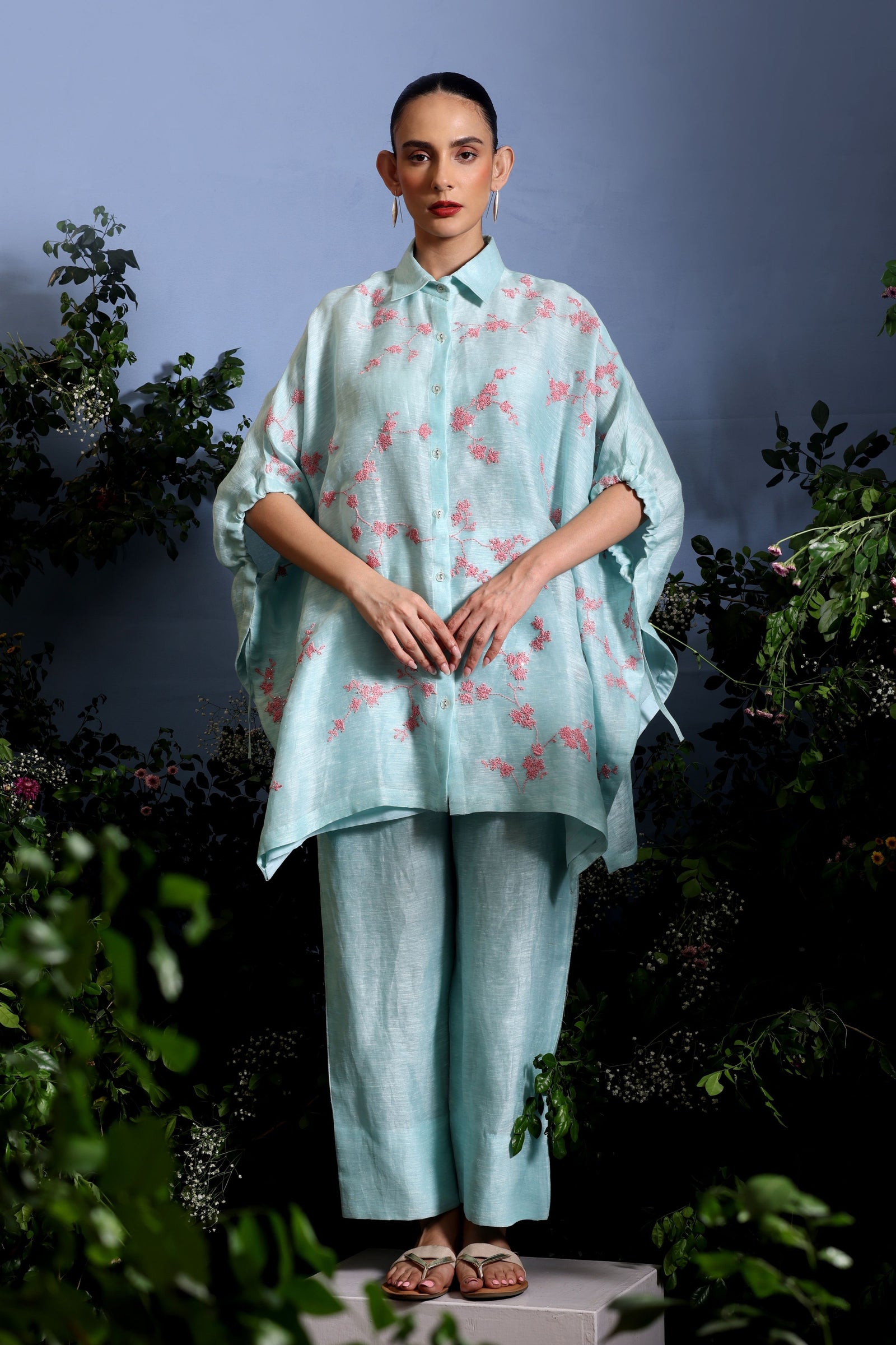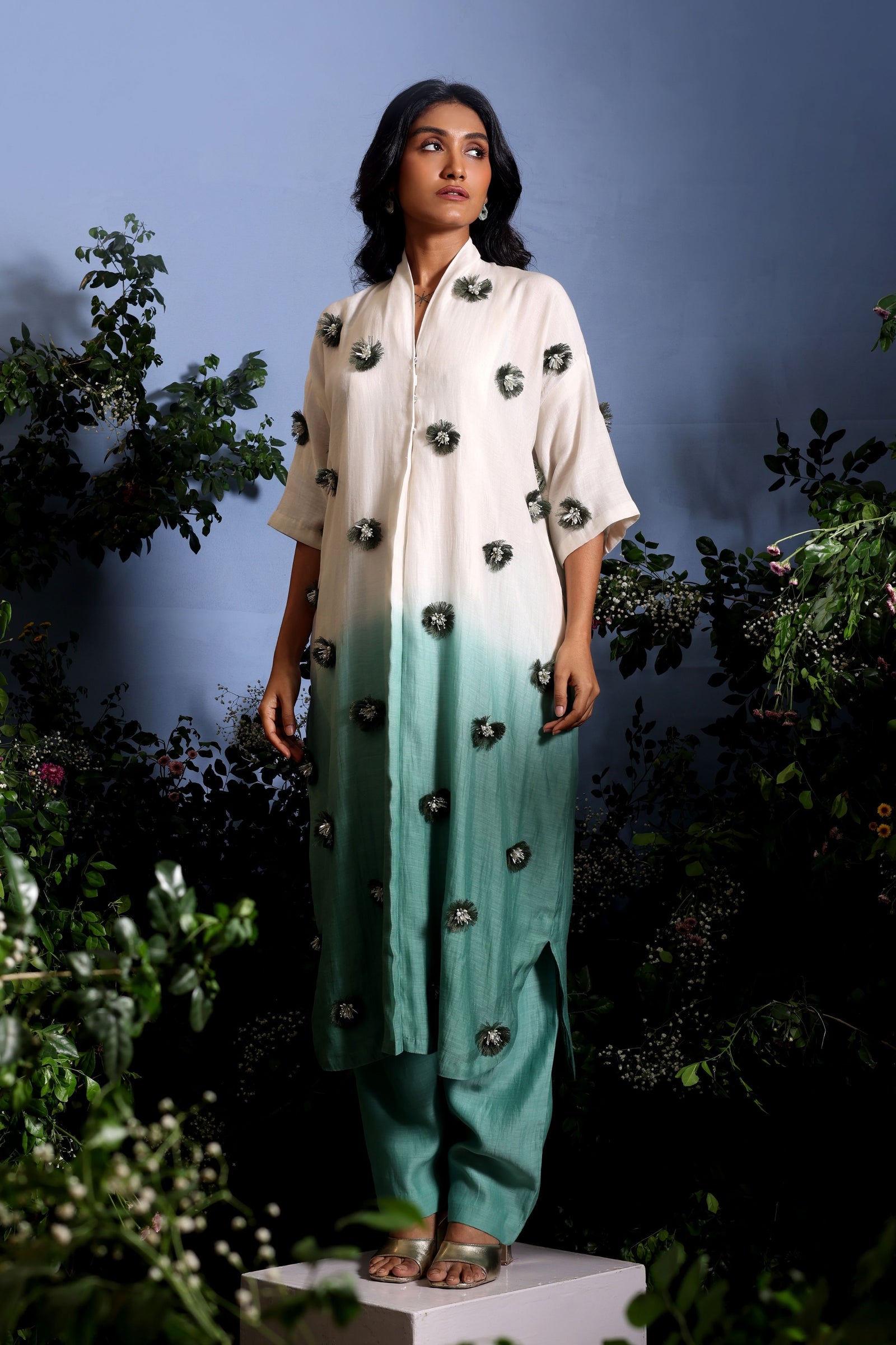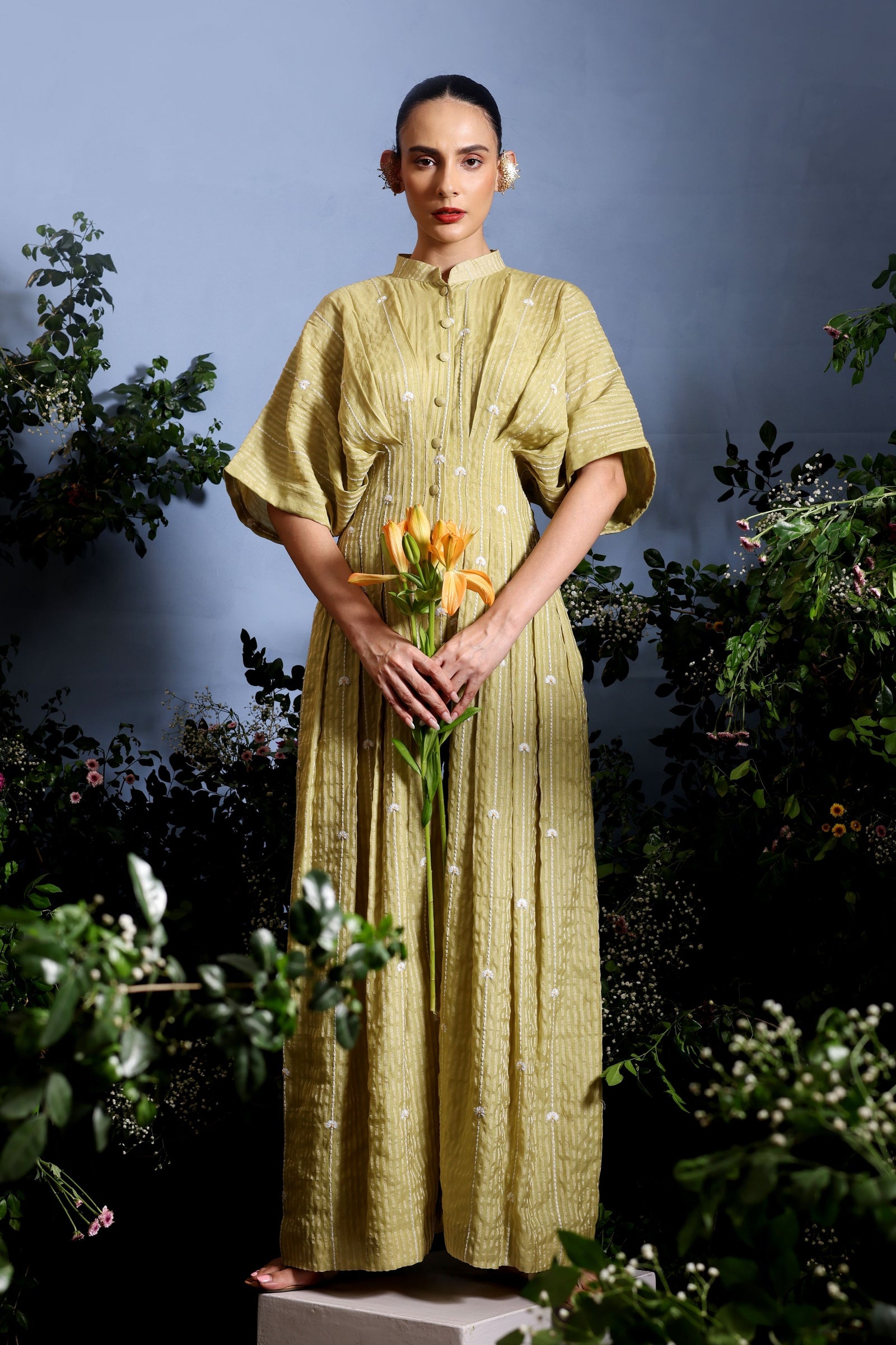 • Pure linen buttoned long shirt dress featuring hand-appliqued large sunflower motifs scattered all over for a bold, statement look. Finished with hand-detailed cuff buttons, it’s breezy, flowy, and perfect for spring-summer blooms.