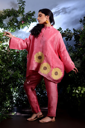 • Crafted in breathable pure linen, this kaftan top features large hand-appliquéd sunflower motifs that make a bold summer statement. Hand-detailed cuff buttons add a touch of artisanal charm, while its relaxed silhouette pairs effortlessly with pure linen straight trousers, creating a breezy, sun-kissed ensemble perfect for warm days.