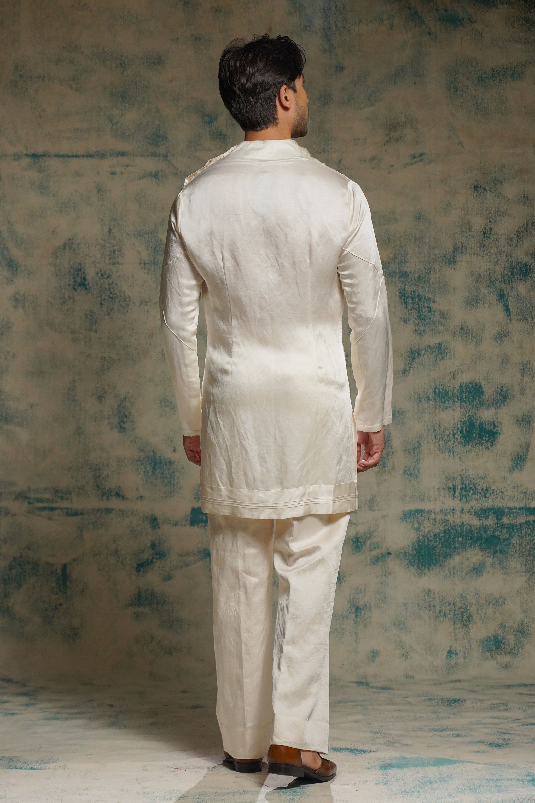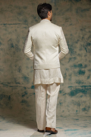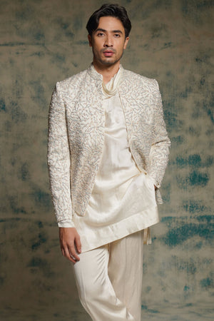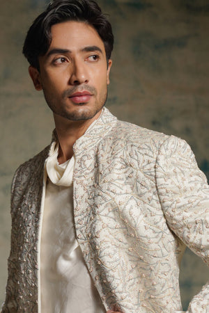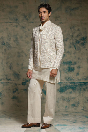 • Presenting our short jacket from the shiva collection in the serene honeyed ivory hue. Hand-embroidered with pastel tones using dori, zari, resham, and zardozi techniques, this piece transforms into an abstract work of art. Its design draws inspiration from the universe envisioned through shiva’s third eye—where all forces and energies unite in harmony for a joyous existence. Paired with a kurta and dhoti-shaped flap trousers, it is a perfect blend of tradition and contemporary elegance.