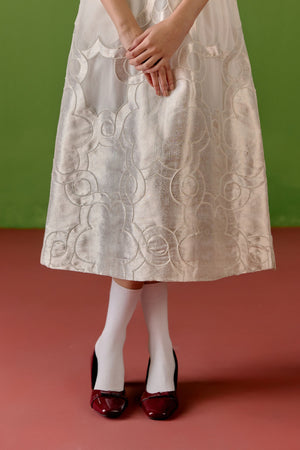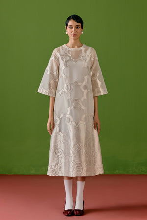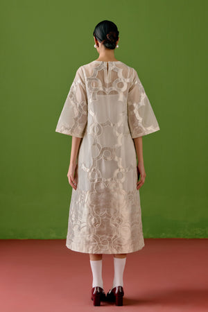 • A masterpiece of craftsmanship and design, this dress is crafted in pure organza silk, elevated with exquisite handwoven tanchoi appliqué work. Light, ethereal, and richly detailed, the piece reflects a harmonious blend of art deco geometry and the intricate symmetry of islamic art, reimagined through a contemporary couture lens. Please note, all pieces are made by hand, celebrating handwoven fabrics and hand made, hence there might be some irregularities from piece to piece.