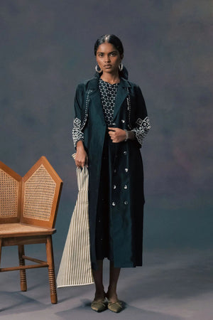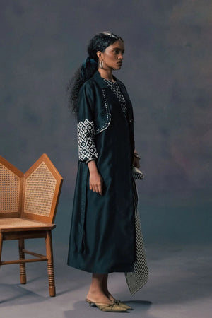 • Indigo silk chanderi embroidered jacket with halter neck jumpsuit