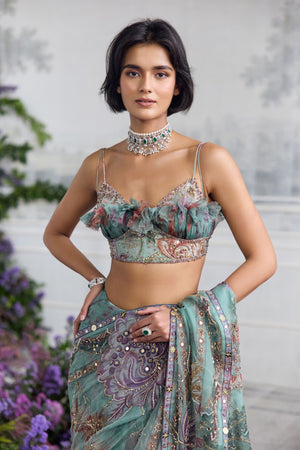 • Hand embroidered ruffled blouse paired with embroidered pre draped saree