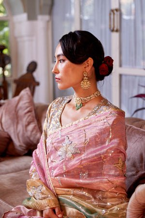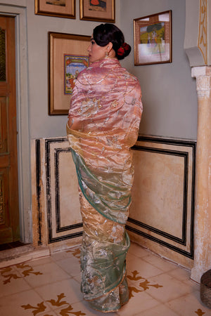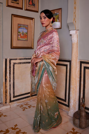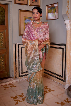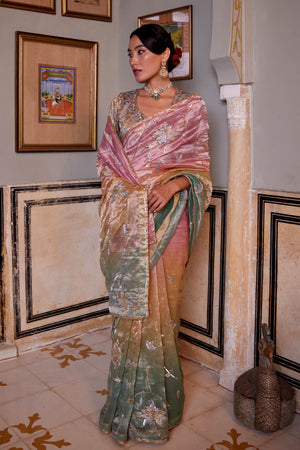 • Ombre shaded tissue saree in gulabi, peela and firozi, embroidered with cutwork and zardosi jaal , paired with a shikaargah blouse in pink .