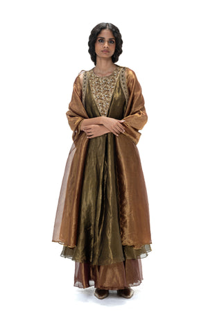 • Ismat kurta set is a sophisticated three-piece ensemble featuring a handwoven, intricately embroidered tissue silk kurta paired with matching gharara and dupatta. Crafted in a striking combination of charcoal and garnet, this set radiates elegance and festive charm, making it perfect for celebrations, weddings, and special occasions.