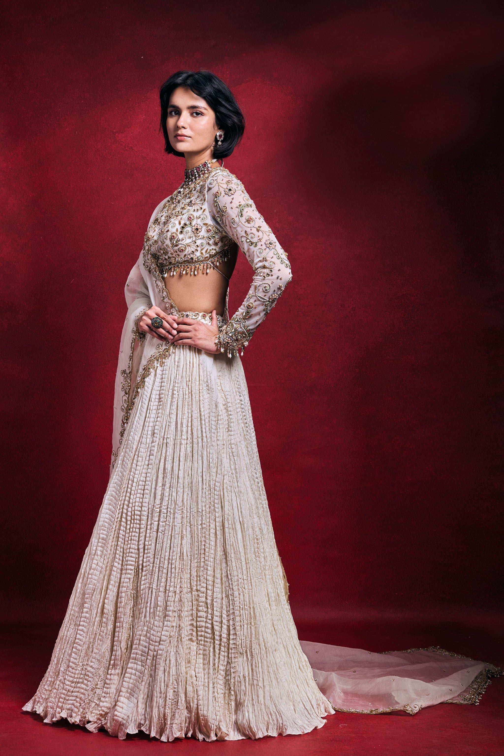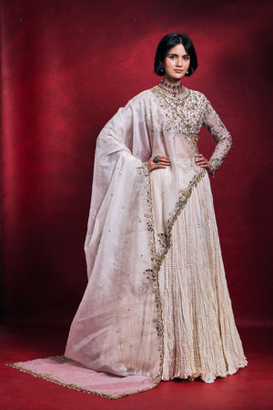 • An elegant ivory ensemble crafted in habutai silk, net, and organza, featuring a beautifully textured skirt and a delicately embroidered bodice. Adorned with intricate stone, resham, mirror, pearl, sequin, dori, sadi, nakshi, and zari work, this piece blends refined craftsmanship with timeless bridal sophistication.