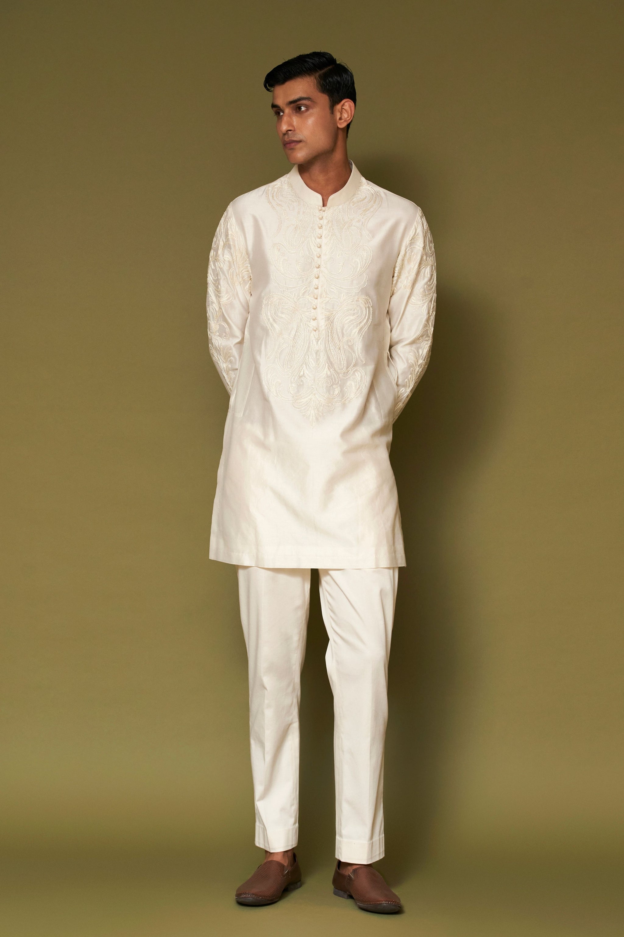• This elegant ivory ensemble features a silk chanderi kurta intricately detailed with dori embroidery, showcasing fine craftsmanship. The front is accentuated with delicate potli buttons, adding a touch of traditional charm. Paired with matching slim pants, it embodies a seamless blend of heritage and modernity.