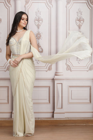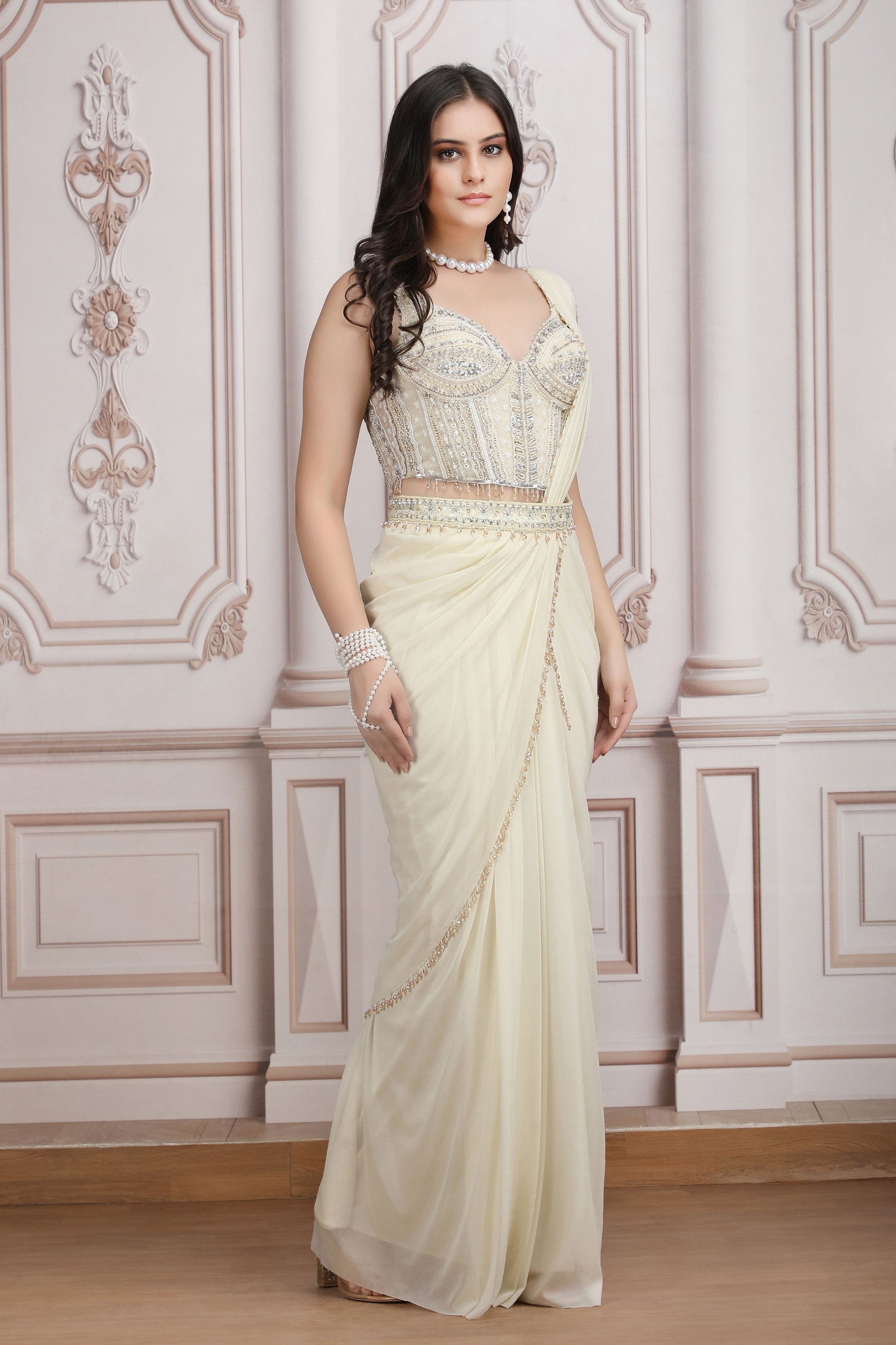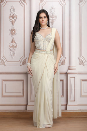 • A fluid ivory saree paired with a structured, embellished corset blouse, blending timeless drape with modern allure for a statement of refined sophistication.