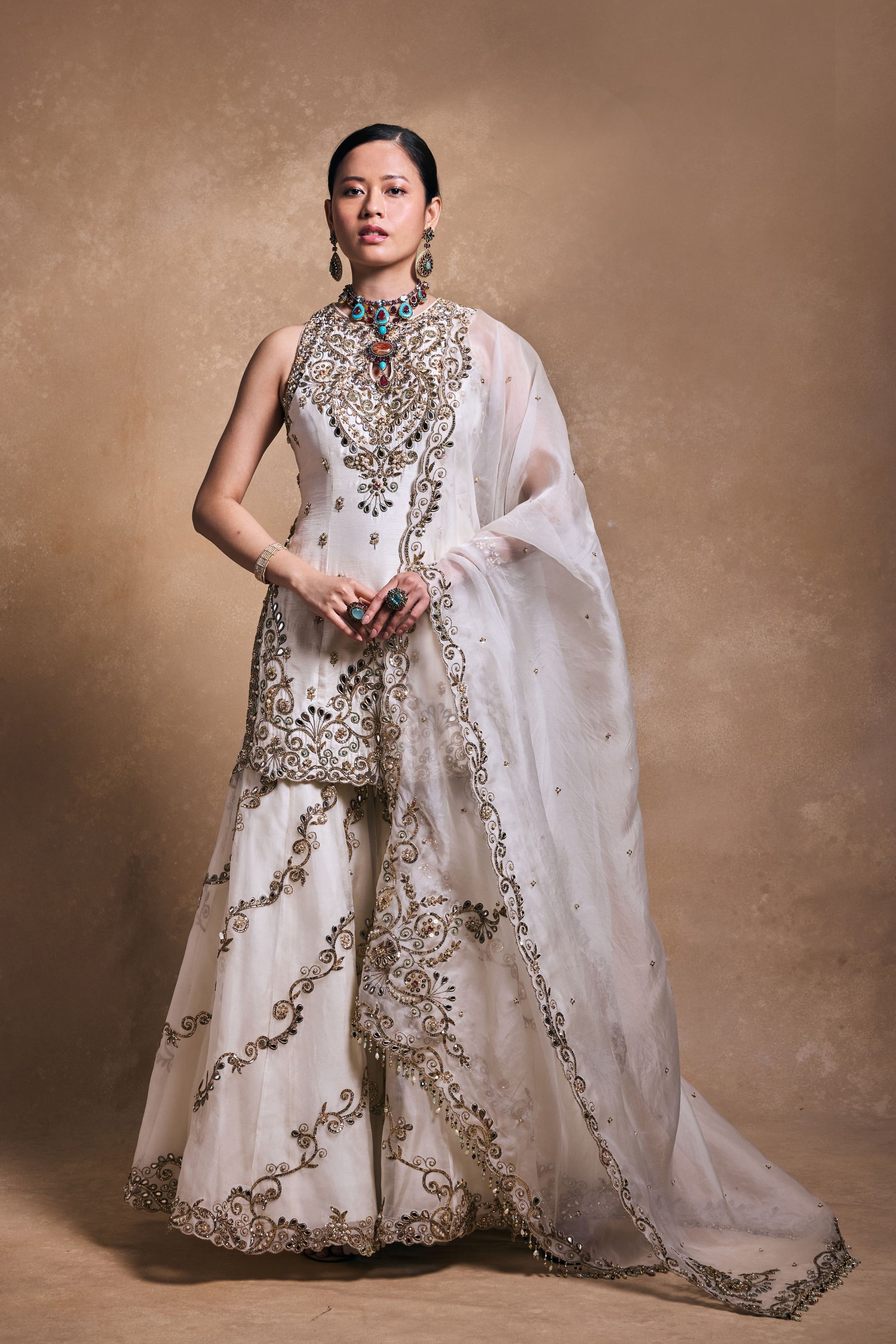 • An exquisite ivory ensemble crafted in delicate organza with a rich raw silk base for a graceful, flowing silhouette. Adorned with intricate stone, resham, mirror, pearl, sequin, dori, and zari embroidery, it exudes timeless elegance and understated luxury,perfect for weddings and refined festive occasions.