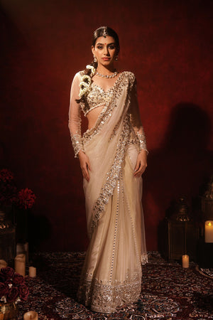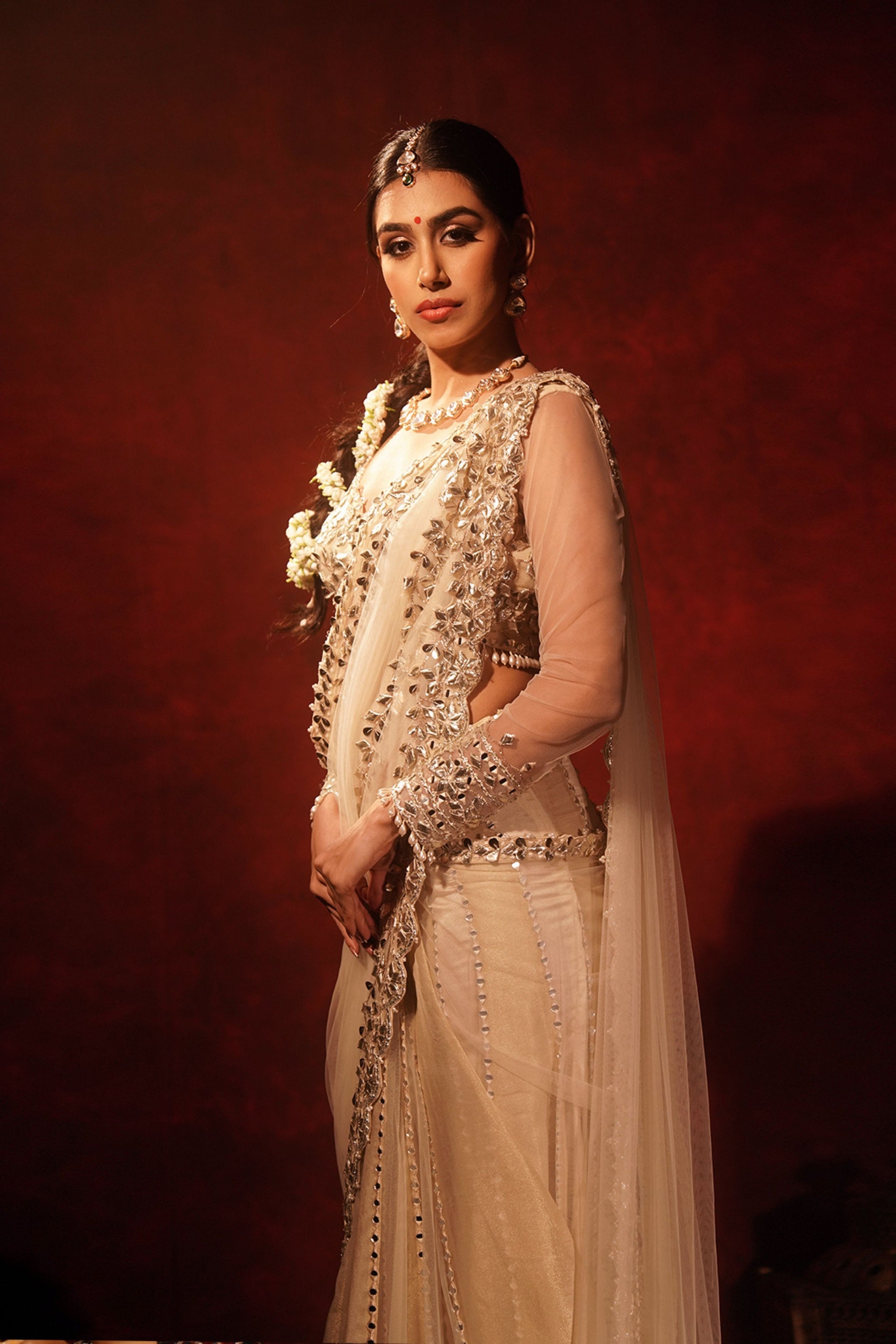 • This exquisite hand Draped saree set embellished with intricate gota patti and mirror work, and adorned further with dainty pearl tassels along the pallu and blouse hem, adding a touch of graceful charm throughout. It is paired with a long sleeved blouse that completes the look with understated elegance and timeless sophistication.