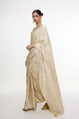 • Handwoven in the kadhwa banarasi technique and crafted from the softest, most fluid satin silk, this ivory masterpiece allows for endless styling possibilities. We recommend experimenting with a kimono-style drape over your shoulders for a relaxed yet polished look. This one's perfect for festive celebrations and wedding occasions, it’s the saree that ensures all eyes are on you.