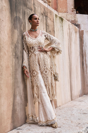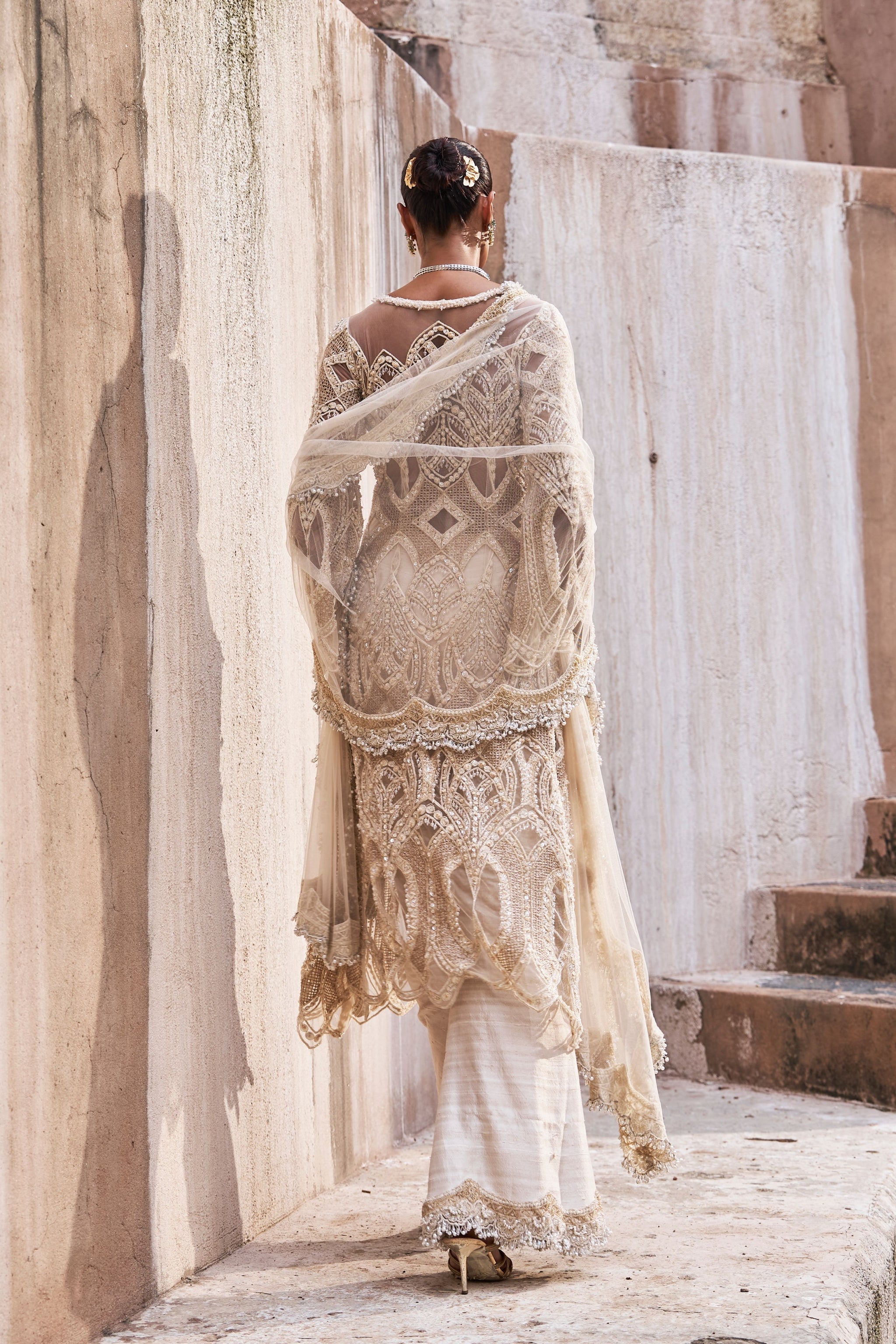 • A serene ivory kurta set featuring delicate two-tone embroidery, paired with raw silk pants that add subtle texture and sophistication. The scallop-embroidered dupatta lends a touch of graceful intricacy, completing a timeless ensemble that blends minimal elegance with festive charm. Perfect for occasions where understated luxury meets contemporary design.