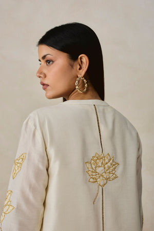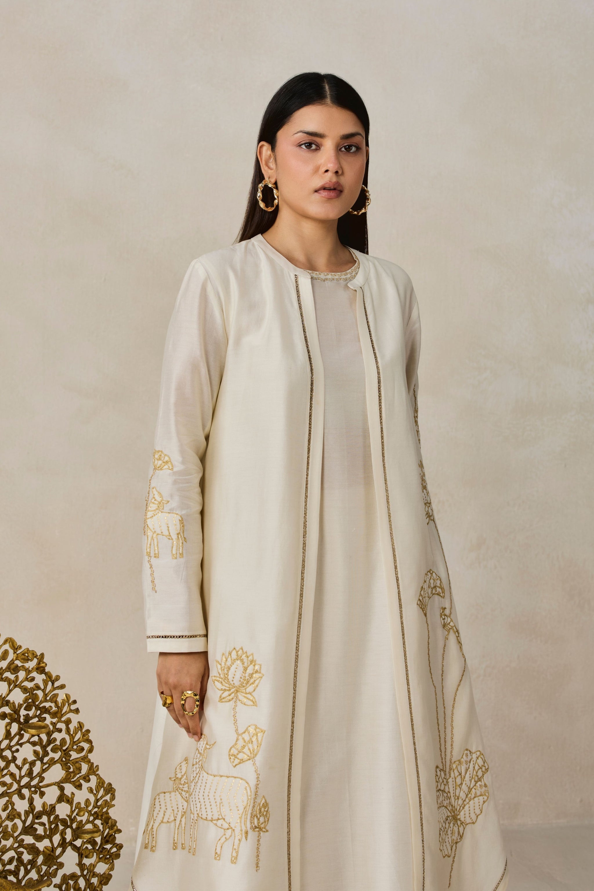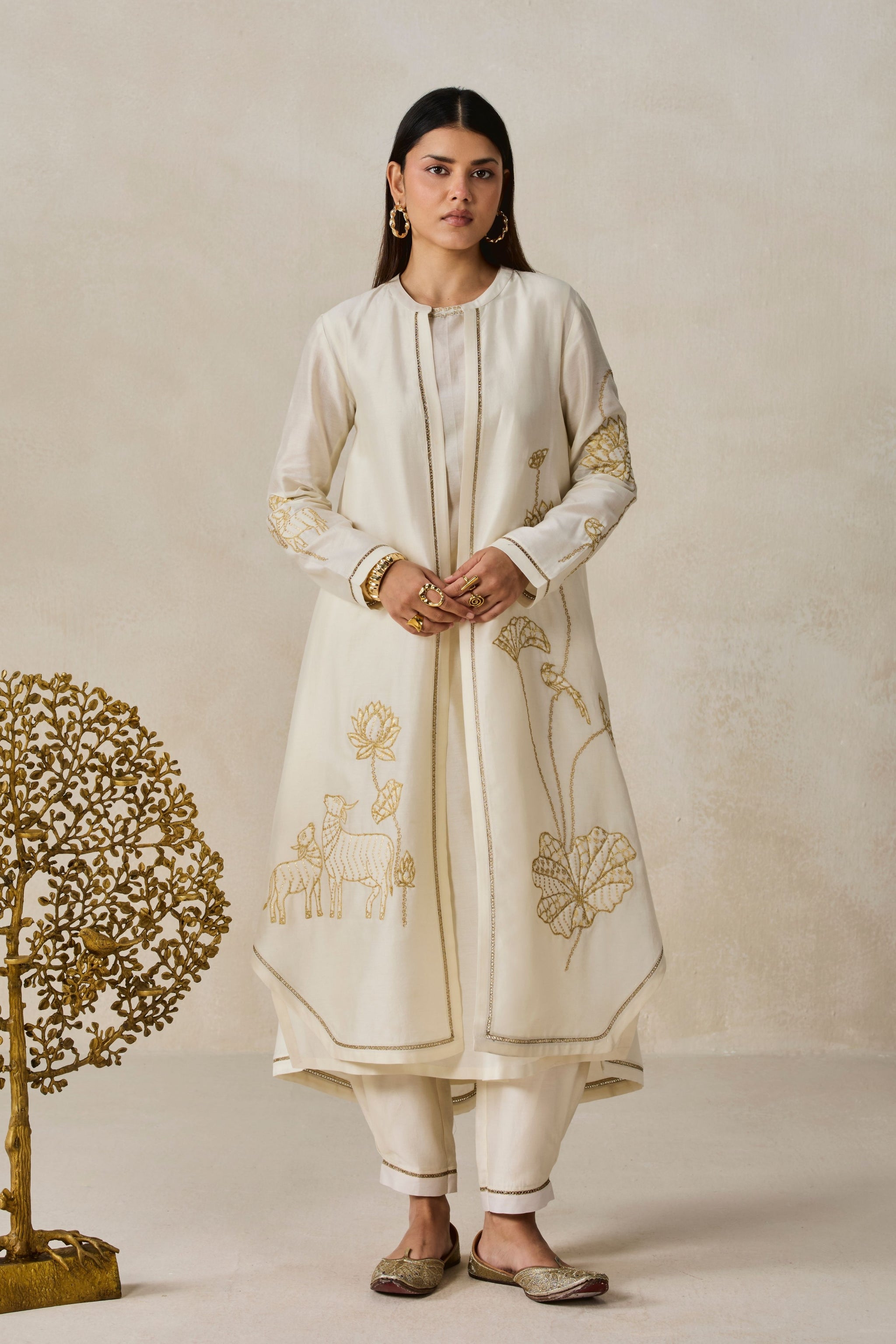 • This is an elegant three-piece jacket kurta and salwar set crafted in fine Chanderi fabric, presented in a serene ivory / soft ecru tone. The ensemble combines a clean architectural silhouette with delicate narrative embroidery, creating a refined balance of tradition and modernity. The kurta is adorned with fine applique work, inspired by Indian folk and natural motifs.