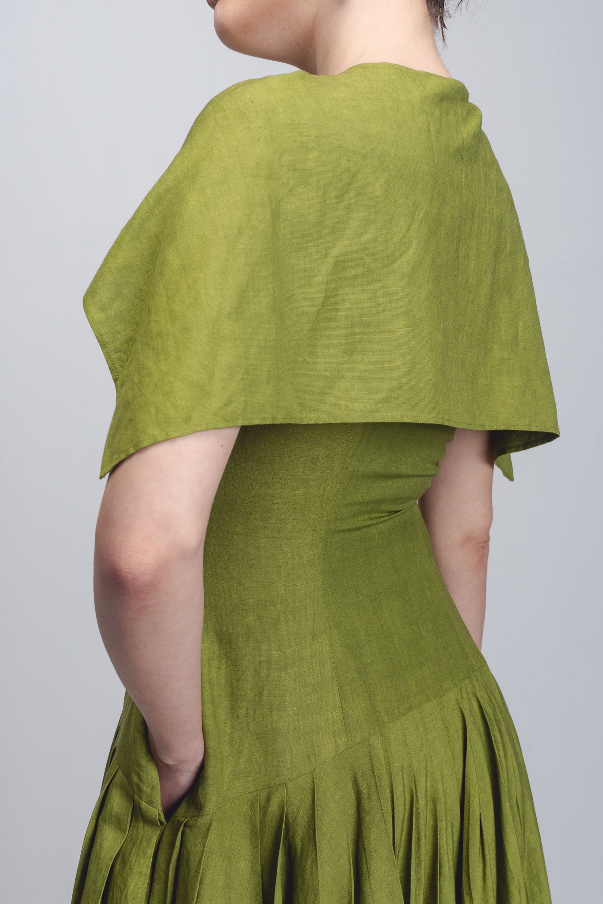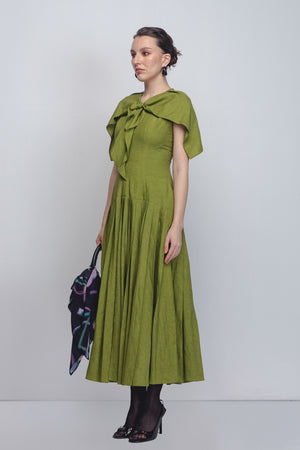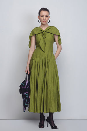 • Tailored in 100% linen, this dress features a clean, sleeveless fit with a neckline accented by a delicate front tie detail. An attached cape drapes elegantly over the shoulders, creating a soft, sculptural frame that enhances the silhouette with quiet drama. Falling from a dropped waistline, the garment opens into a heavily pleated skirt that adds generous volume and fluid movement, balancing structure with ease. The model is 5'10", and the garment length is 55 inches.