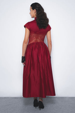• This silhouette embodies femininity, elegance and sensuality. A reinterpretation of opera dress, the ensemble features layered interplay of materials highlighted with lace overlay at the bodice creating a peek-a-boo detail at the waistline