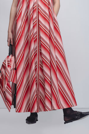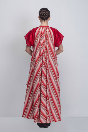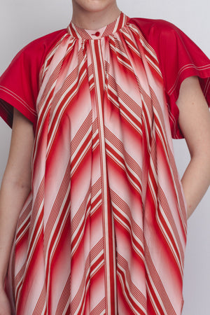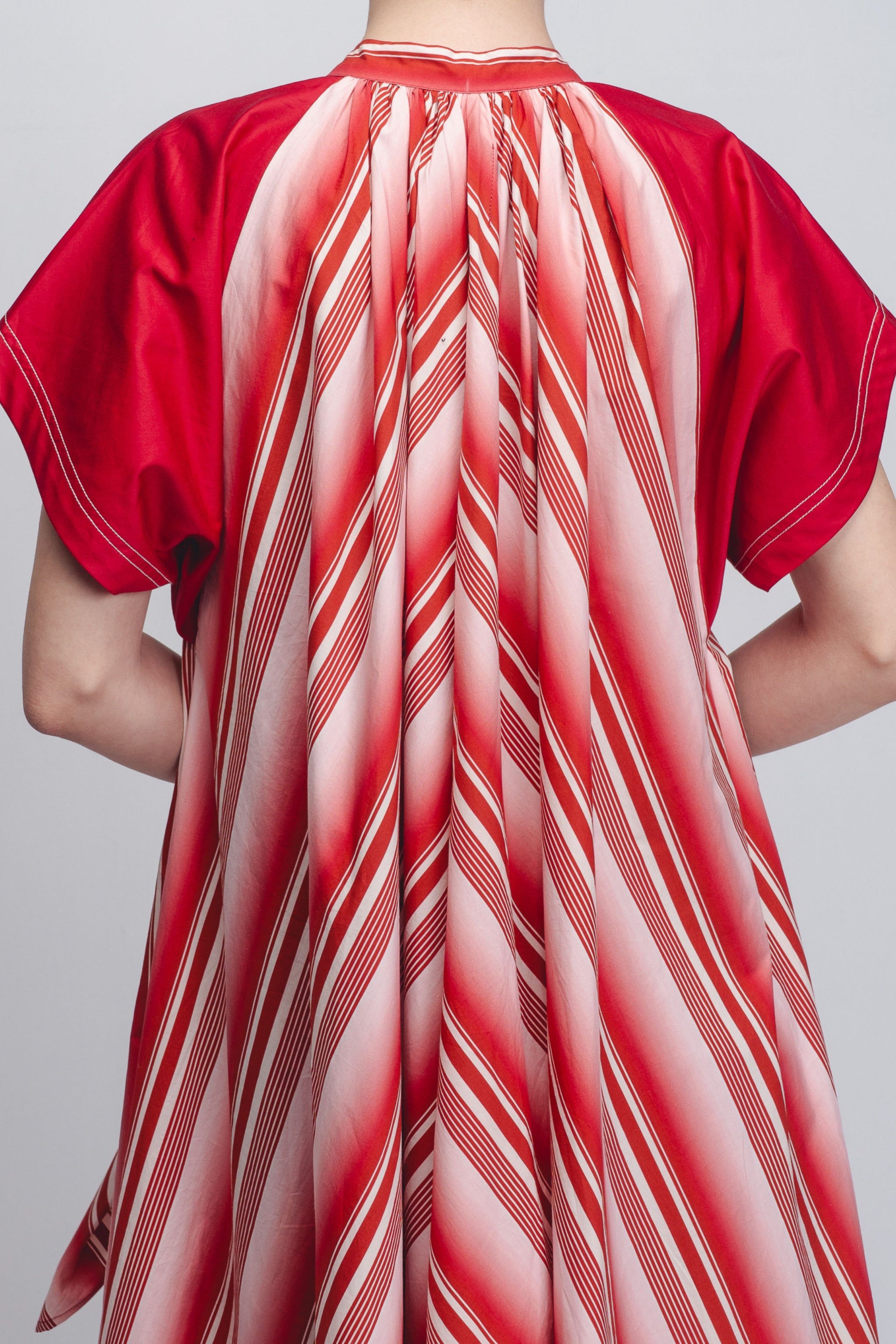 • A playful, graphic take on the classic tent dress silhouette, this garment is crafted in striped 100% Cotton Poplin. The design features a high, gathered neckline and a functional button front opening, transitioning into a sweeping A-line frame. Contrasting structured black cap sleeves provide a sharp architectural counterpoint to the fluid body. The model is 5'10 and the garment length is 55 inches.