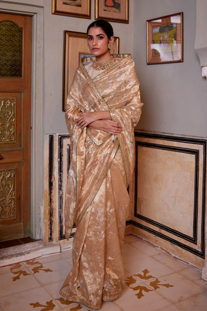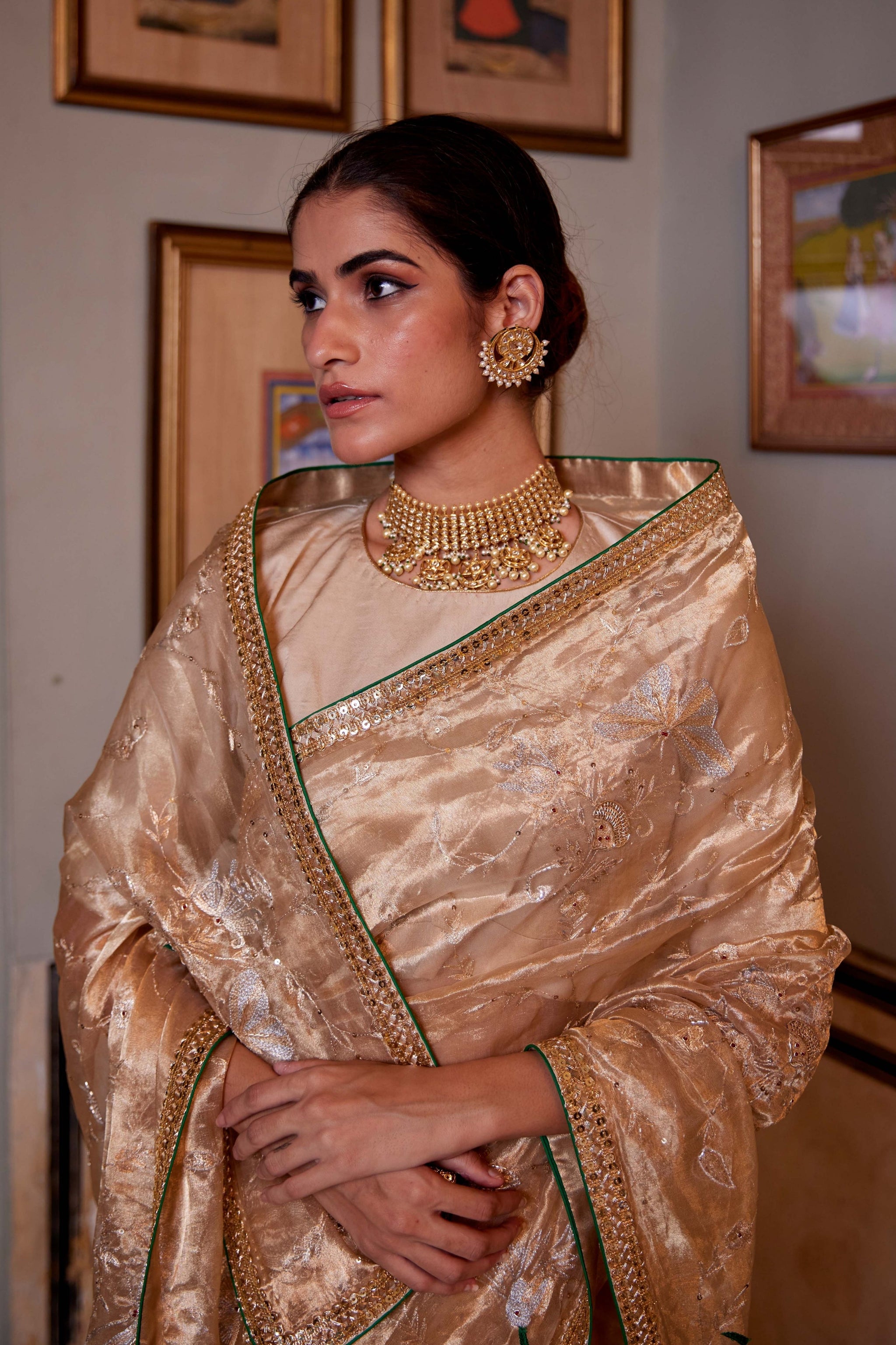 • Kaaga koyal gold tissue saree , embroidered in ganga/jamuni aari zardozi embroidery, finished with handmade kinore, paired with gold tissue blouse.