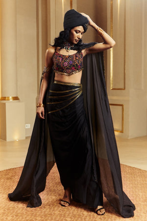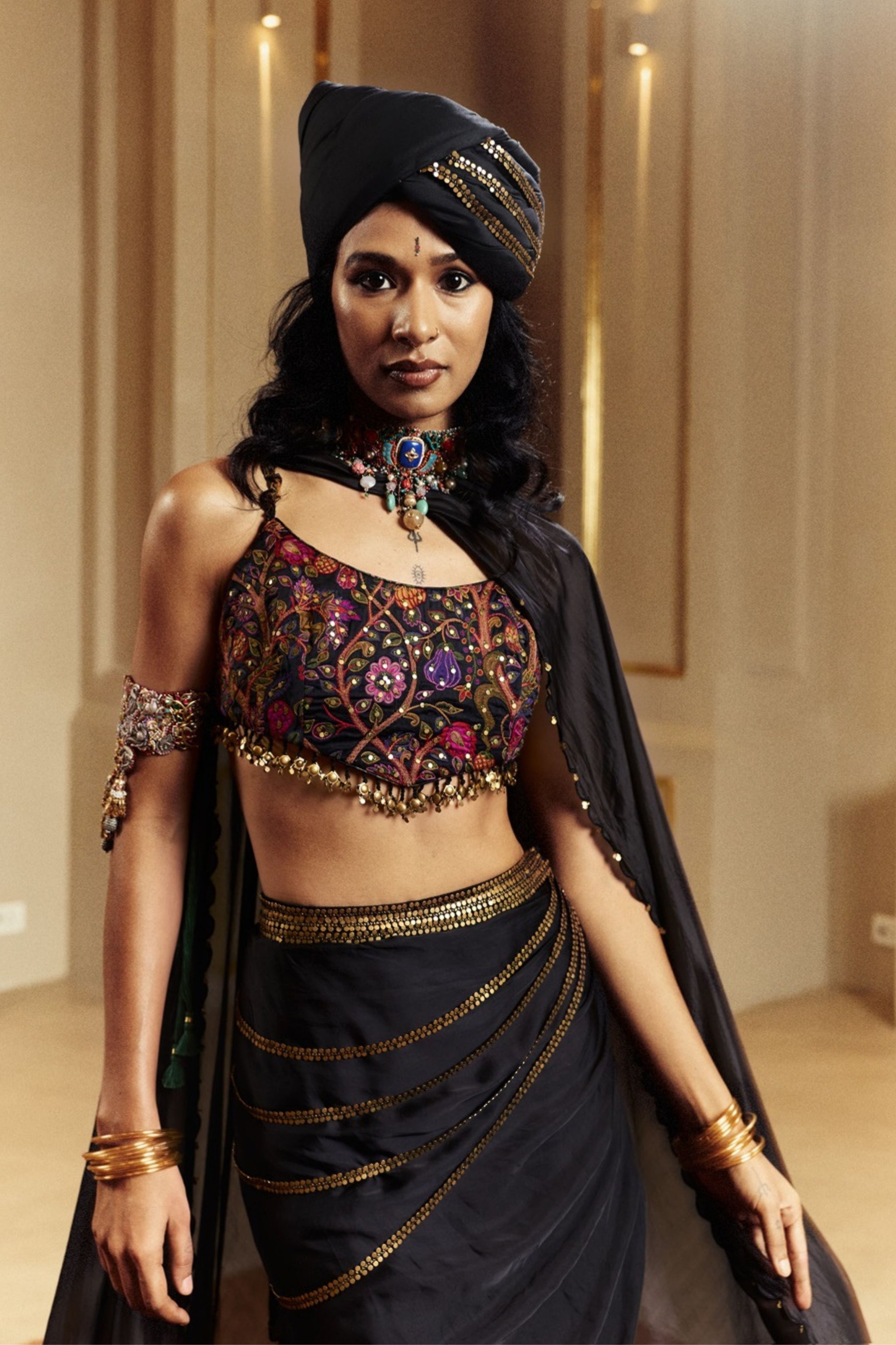 • Get ready to turn heads in our kasundi choli ke peeche skirt featuring a handkerchief top blouse with an open-string back and a cutwork dupatta. The outfit is embellished with antique logo coin embroidery which have been crafted in separate patches, and then fused together to create a unique collage of flora and fauna motifs. It's sexy, statement-making and for the girl of today.