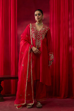 • Red silk chanderi a-line kurta with thread and hand embroidery. Paired with an embroidered silk organza red dupatta and comes with matching silk chanderi embroidered pants.