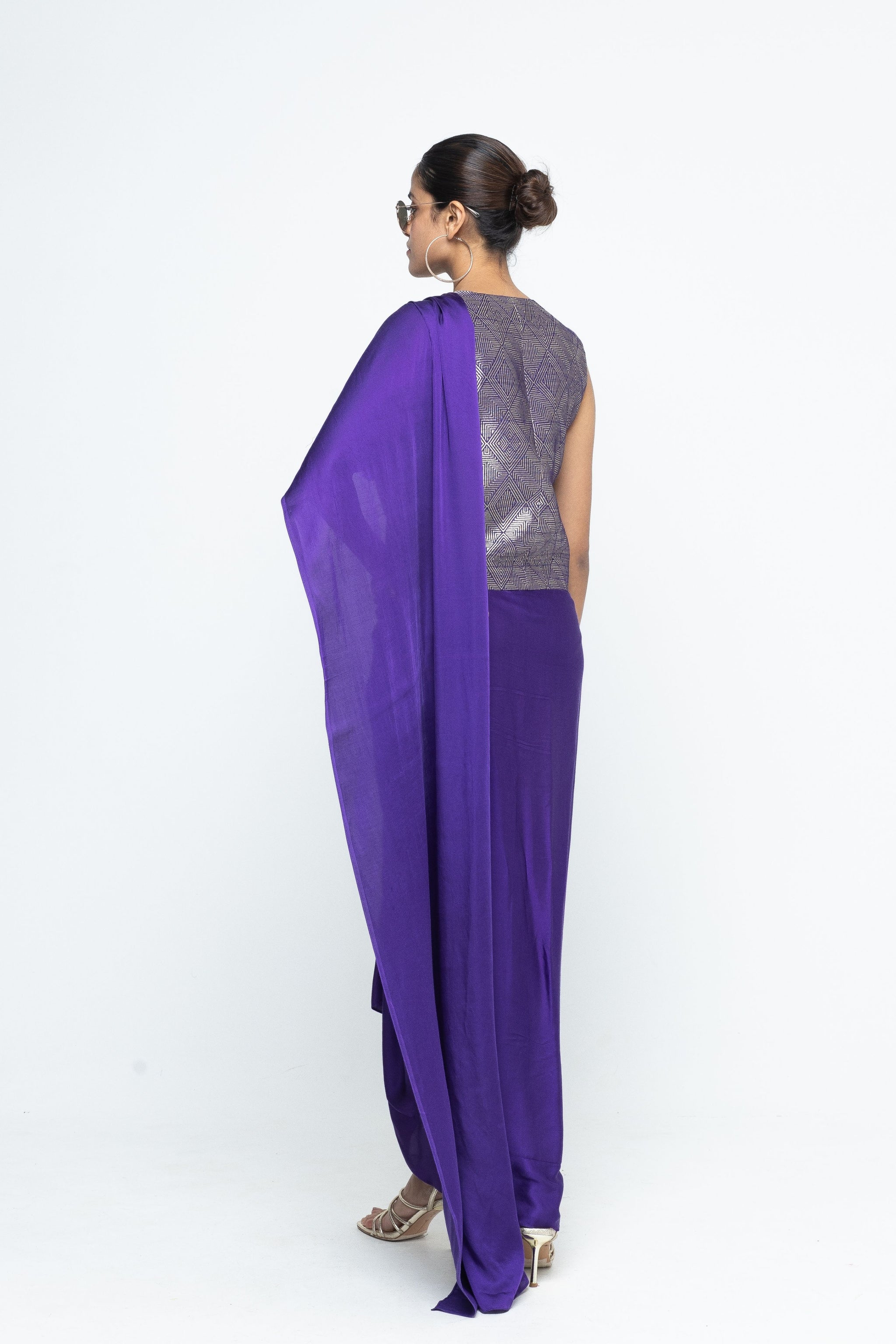 • Purple brocade raw silk waiscoat paired with detachable pleated pallu and matching tie detail skirt.
