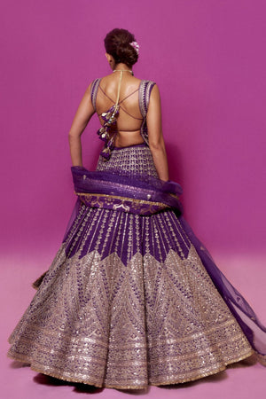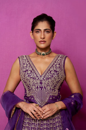 • The sleeveless V-neck blouse features heavy handwork that mirrors the grandeur of the voluminous flared skirt, which is embellished with detailed motifs and a heavily bordered hemline. The matching dupatta in sheer fabric is finished with ornate embroidery and a delicately worked border, perfectly complementing the ensemble.