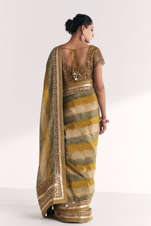 • Kusum lime green saree in tissue with heavy embroidered border elevates the style and adorned with the heavy blouse making it perfect for festive occasions and cultural celebrations.