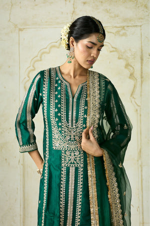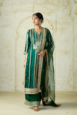 • Showcasing a straight-cut kurta embellished with intricate embroidery, delicate patterns along the neckline, front panel, and borders, exuding timeless elegance. It is paired with matching palazzo featuring heavily embroidered hems that enhance the regal appeal. The sheer dupatta, adorned with scattered motifs and an ornate embroidered border.