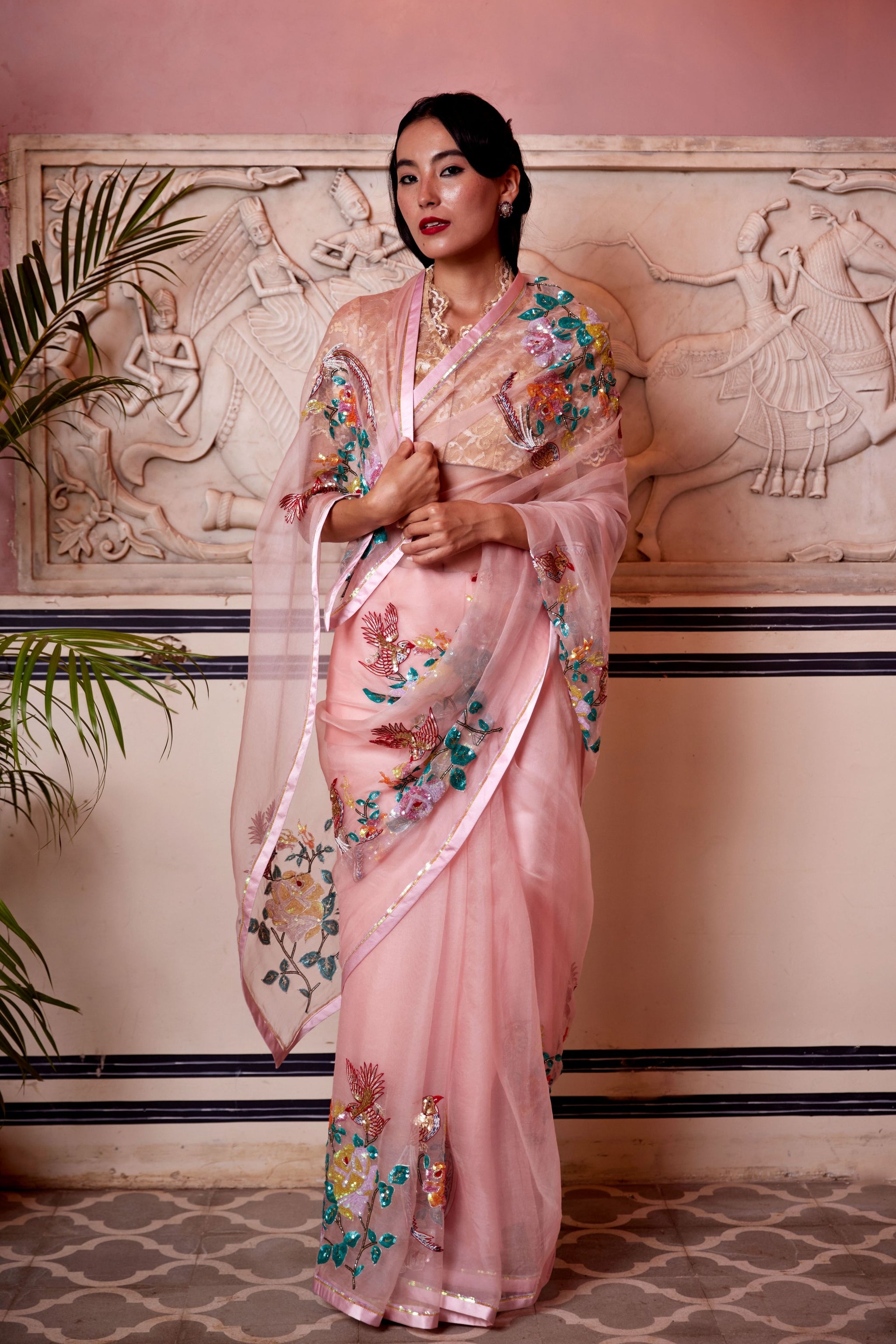 • Blush pink organza saree embroidered with motifs inspired by heritage shikargah brocade in shell sequins and zardozi.