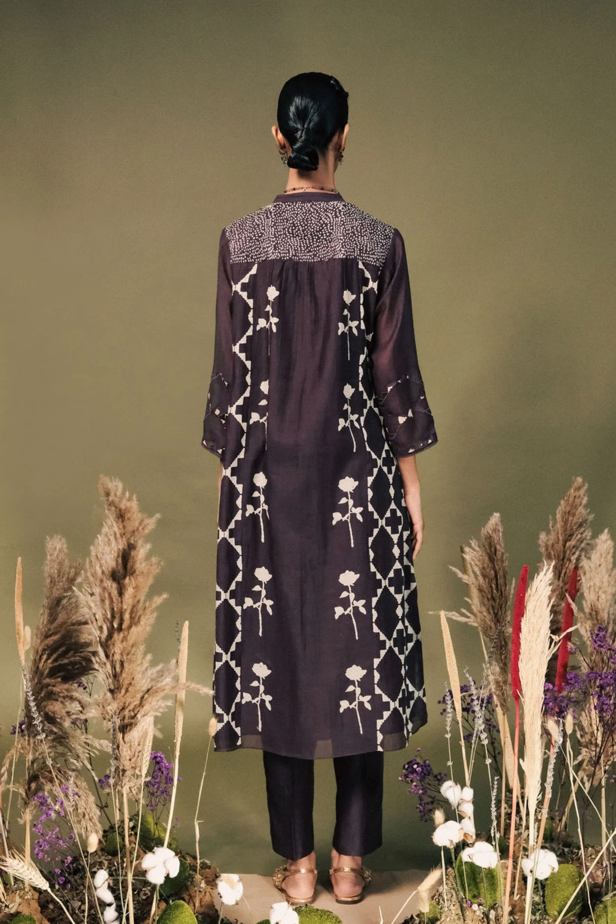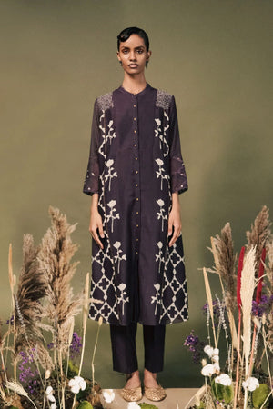 • Lavender front open tunic in mul chanderi with embroided sleeves and pants in silk chanderi