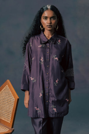 • Lavender rose print drop shoulder shirt in mulberry silk with straight pants in silk chanderi