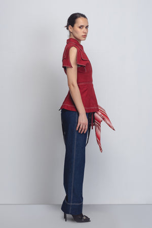 • The top features a sharp, exaggerated, multi-layered flap detailing at the shoulders, which creates a sharp, cap-sleeve effect. It is cinched at the waist with a delicate tonal tie-belt. Every seam and edge is emphasized by contrast white topstitching, highlighting the precise paneling. The model is 5'10 and the garment length is 25 inches.