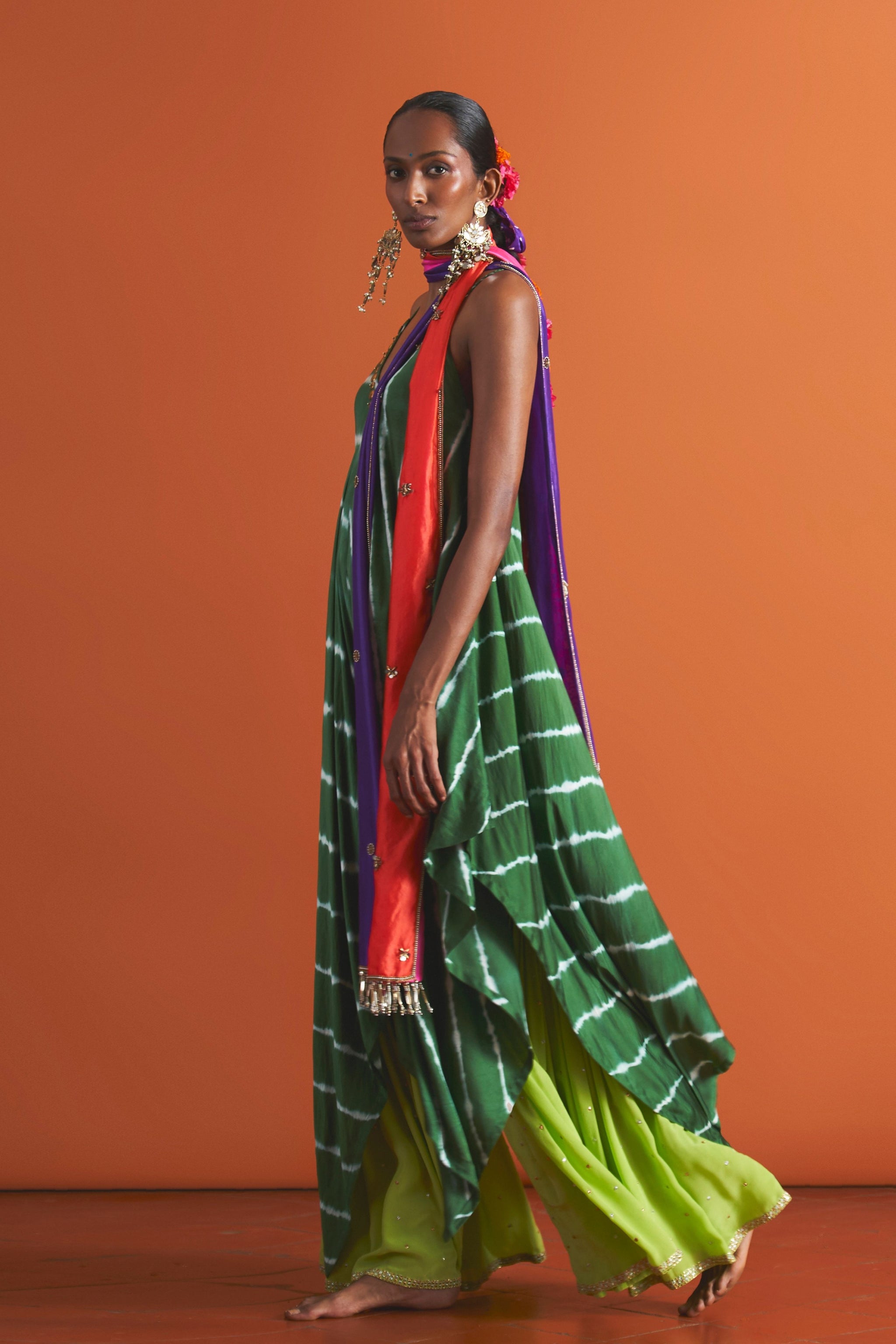 • This ensemble consists of an emerald green leheriya handkerchief kurta, a parrot green embroidered gharara, and either a purple organza stole or an orange stole.