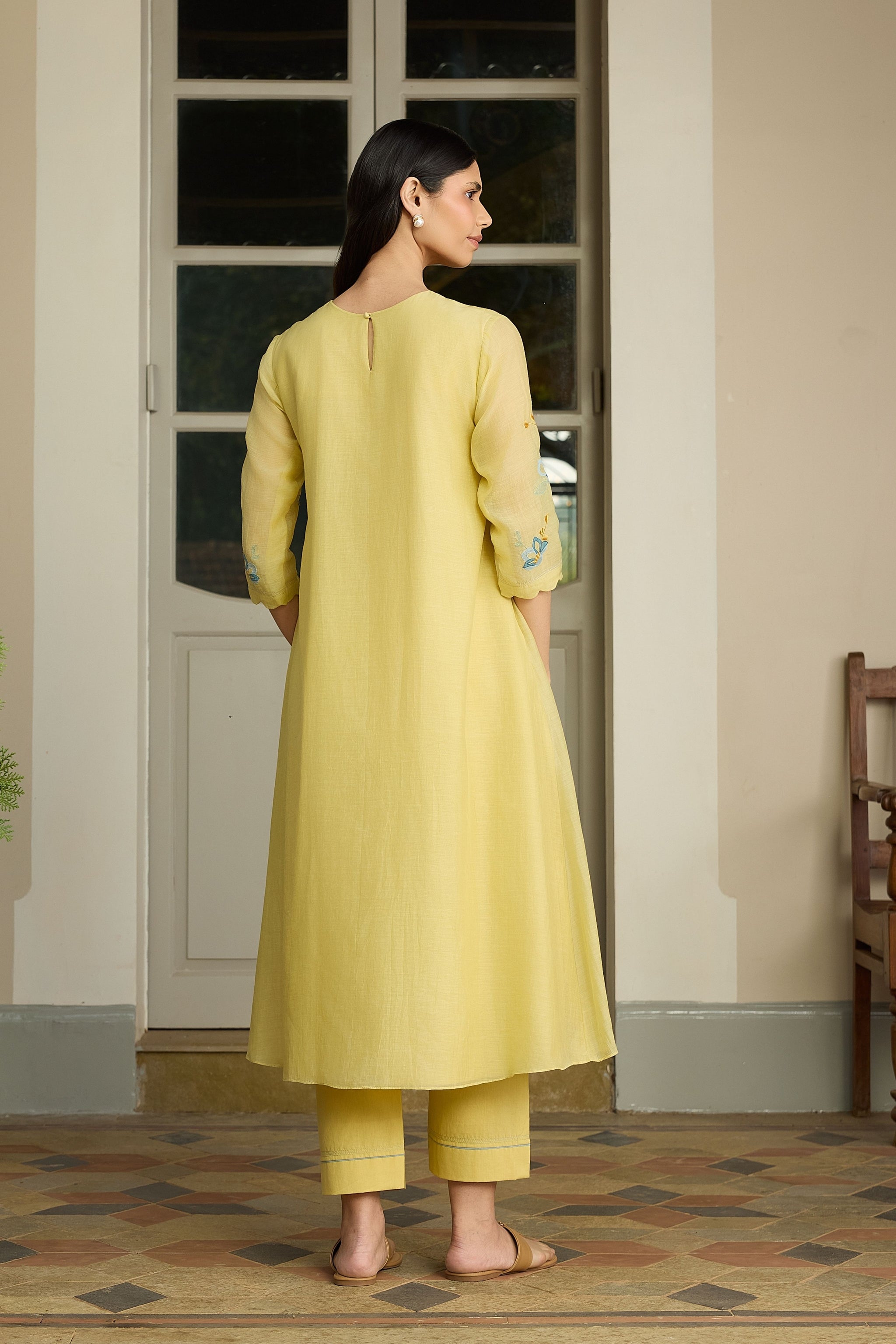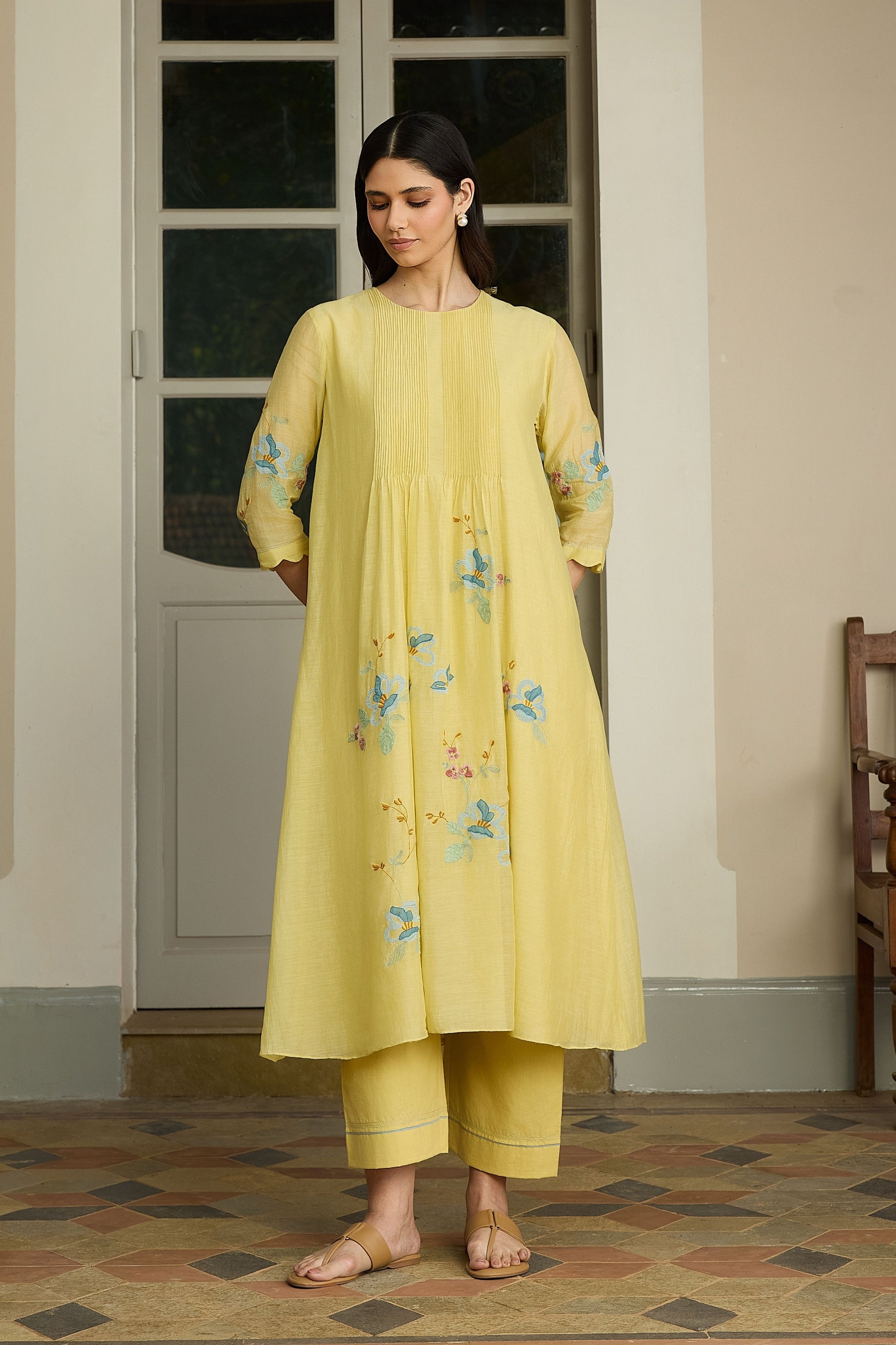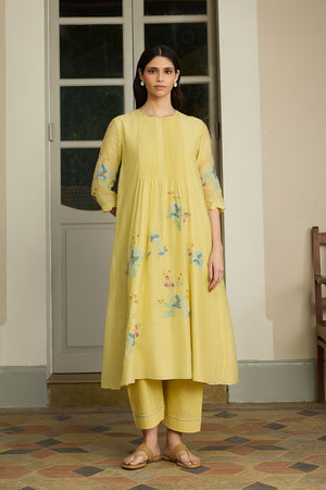 • The lemon applique tunic set features delicate pintucks around the neckline, while applique blooms are gently scattered at of the kurta, adding a soft, charming touch. The sleeves carry matching bloom accents, and the look is completed with coordinating pants for an easy yet polished feel.