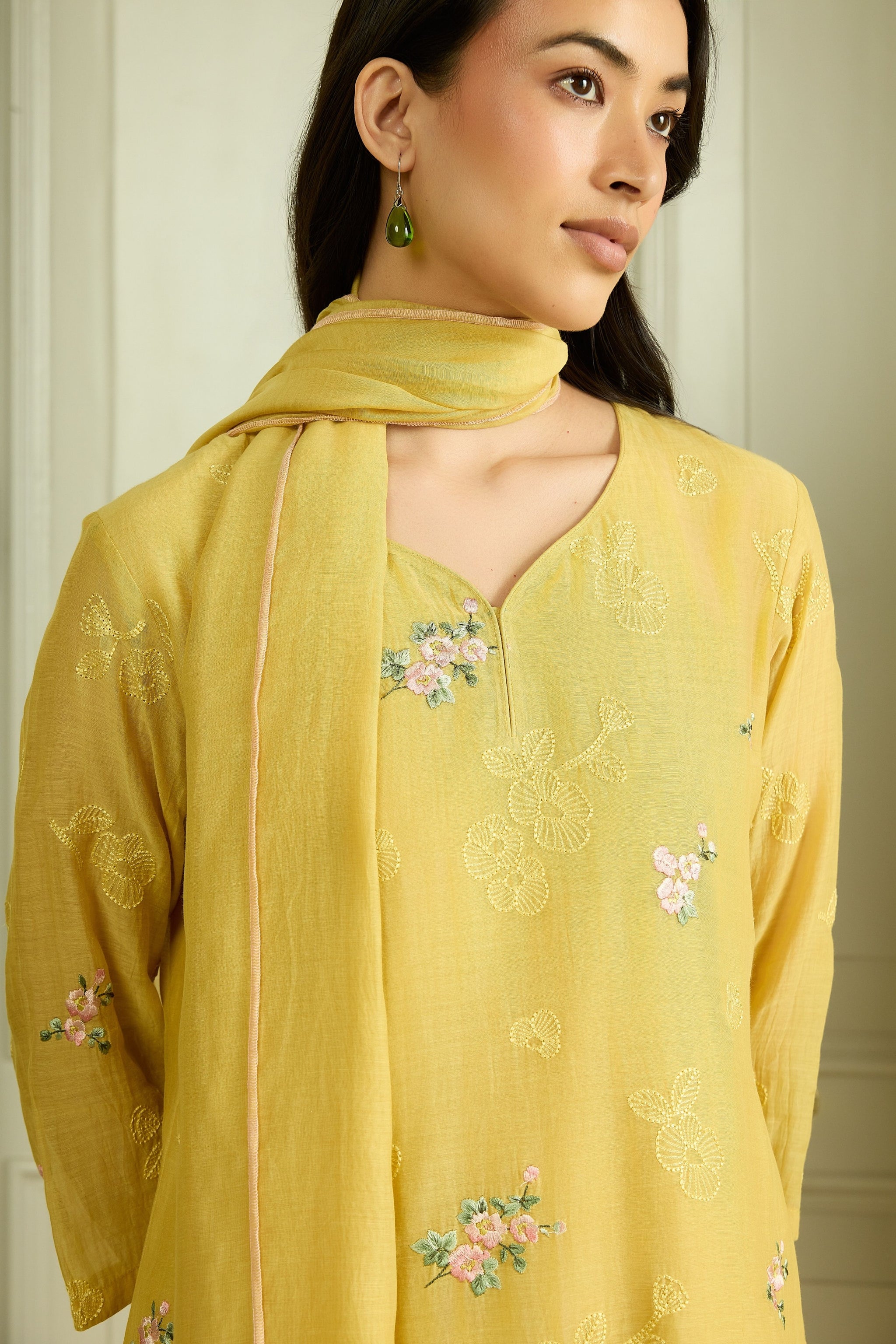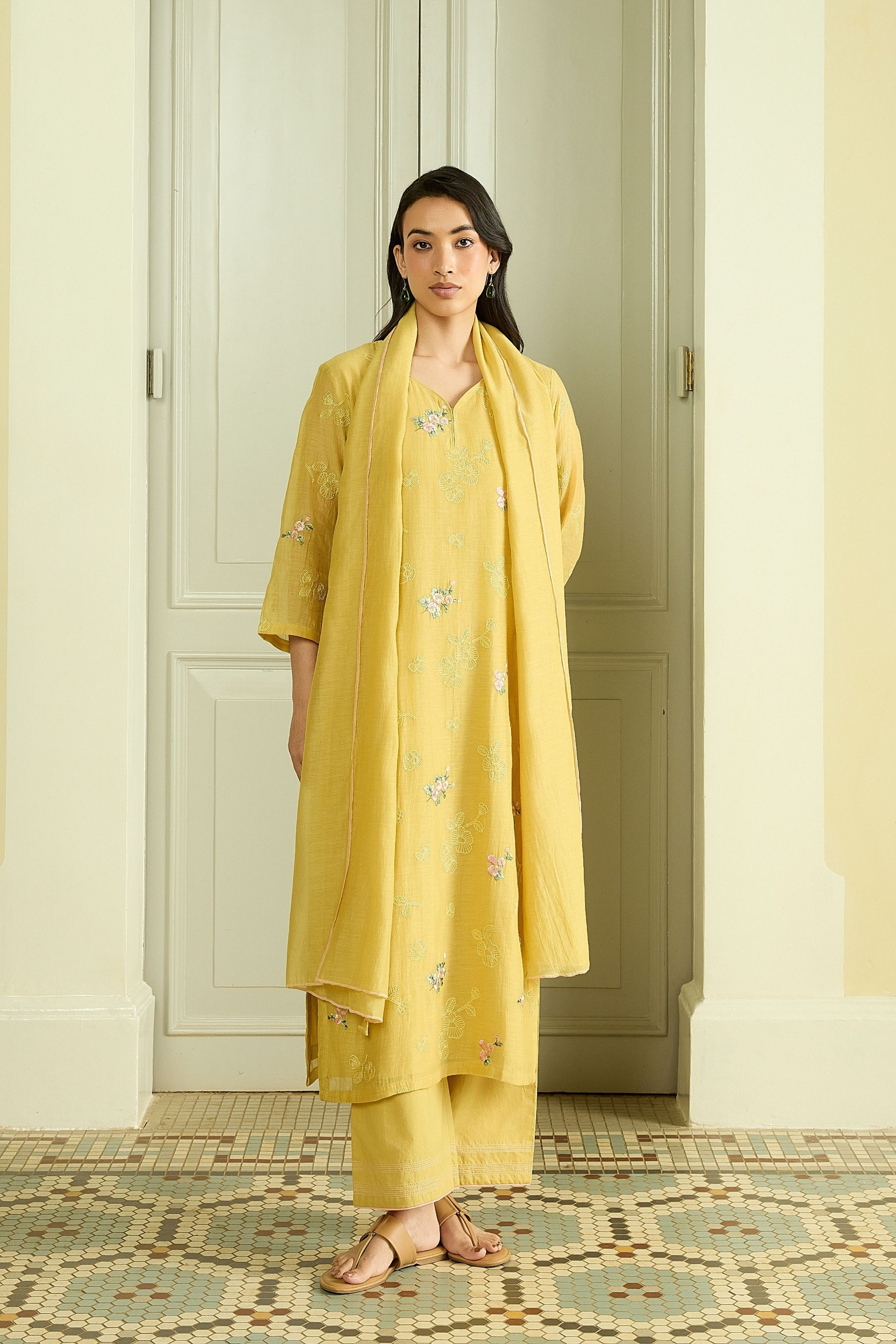 • The lemon embroidered floral kurta set is defined by delicate floral embroidery across the kurta and sleeves. Fine thread work adds subtle texture while keeping the look light and elegant. It is paired with matching pants and a coordinated dupatta, finished with our signature tassels that bring the entire ensemble together.