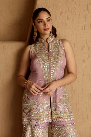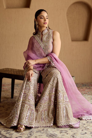 • Lilac tissue halterneck with purple patchwork kurta garara set embroidered with zari mirrorwork