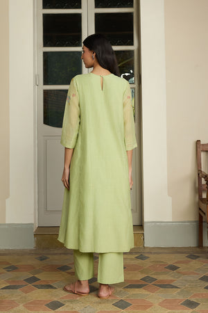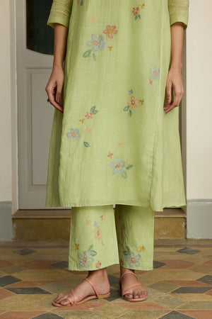 • The lime embroidered floral tunic set features delicate thread embroidered blooms scattered across the kurta and sleeves, bringing a soft handcrafted charm to the piece. The sleeves are finished with gently pintuck cuffs that add subtle volume. Paired with matching pants detailed with delicate bloom accents, the set comes together in a look that feels light and thoughtfully detailed