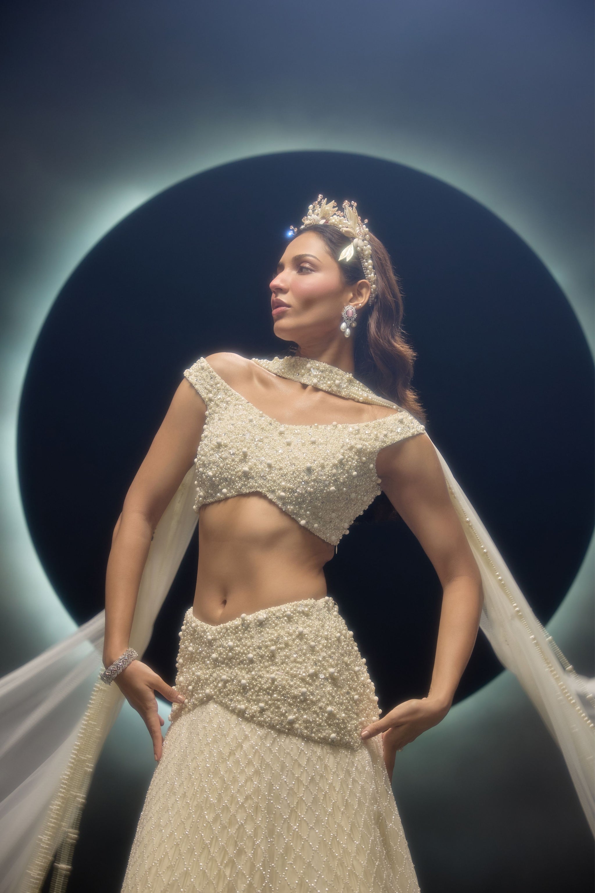 • Ivory b net lehenga set with a viscose bustier and soft net dupatta